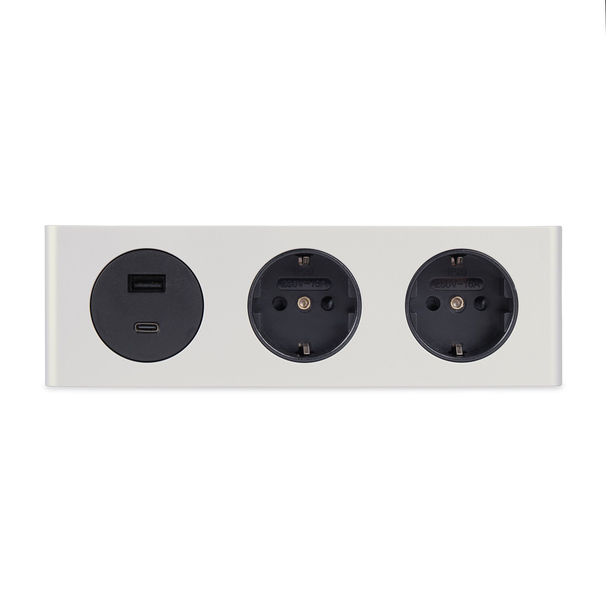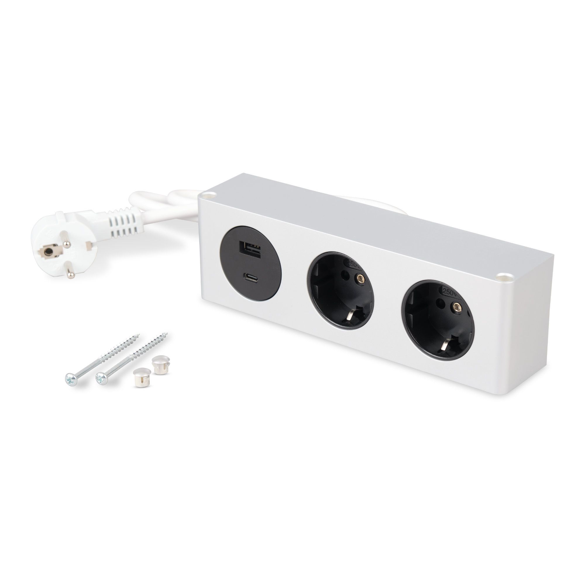 kalb | 3-fach Steckdosenleiste zur Montage, 2x 230V und 2x USB Steckdosen, 200x46x62.5 mm, Anschlusskabel mit Stecker, silber B-Ware