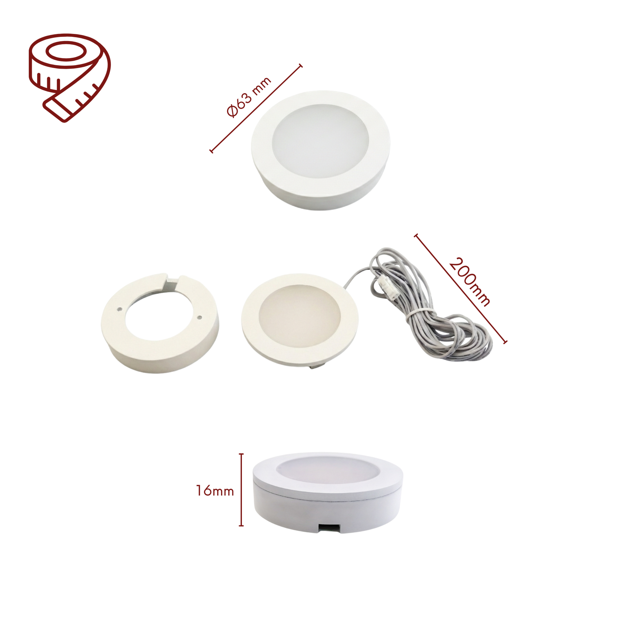 Produktmaße: 63 mm Durchmesser, Höhe: 16 mm bei Unterbau / 3mm bei Einbau, Mindesttiefe Einbauloch 10 mm