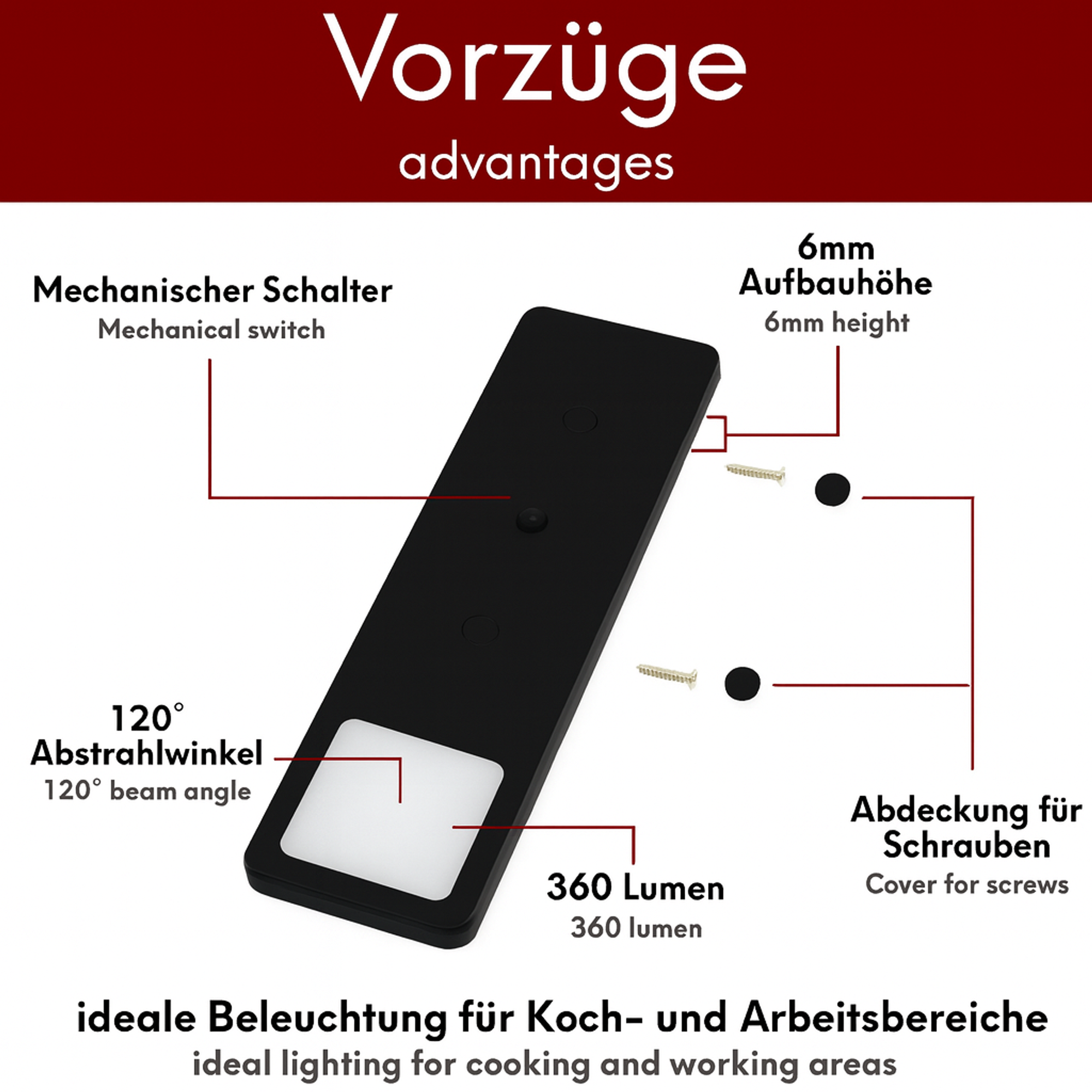 【DETAILS】PLUG and PLAY (anschlussfertiges Sets für 230V) (je Unterbauleuchte mit LED): Masse: 190x52x6 mm (LxBxH), Lichtfarbe: warmweiss/neutralweiss (3000k/ 4000k) (je nach Auswahl), Leistung: 3W, Kabellänge (je Leuchte): 2000 mm, mechanischer Schalter