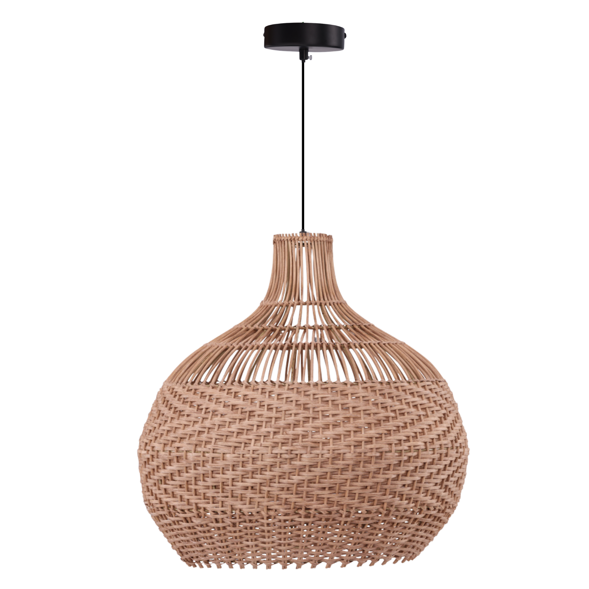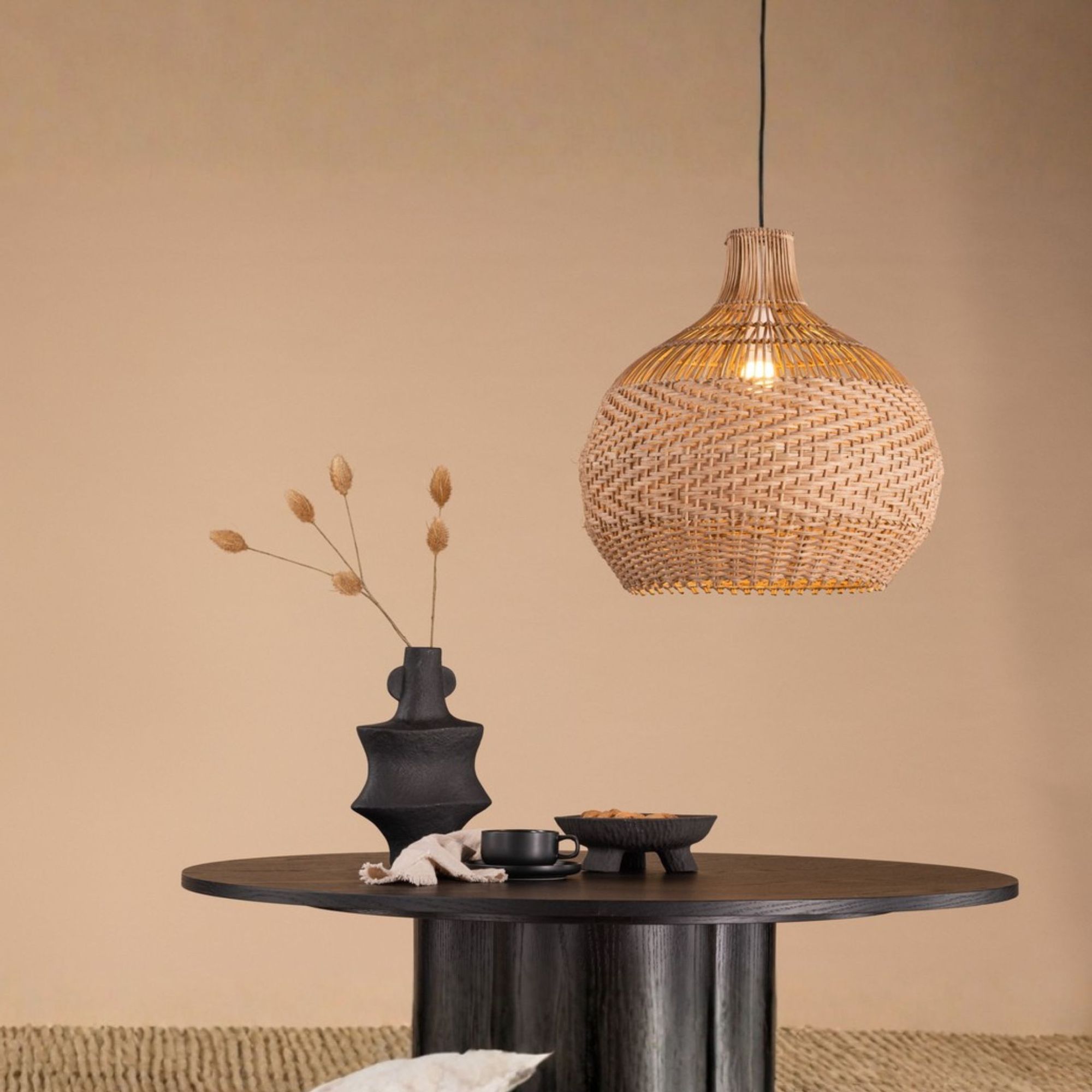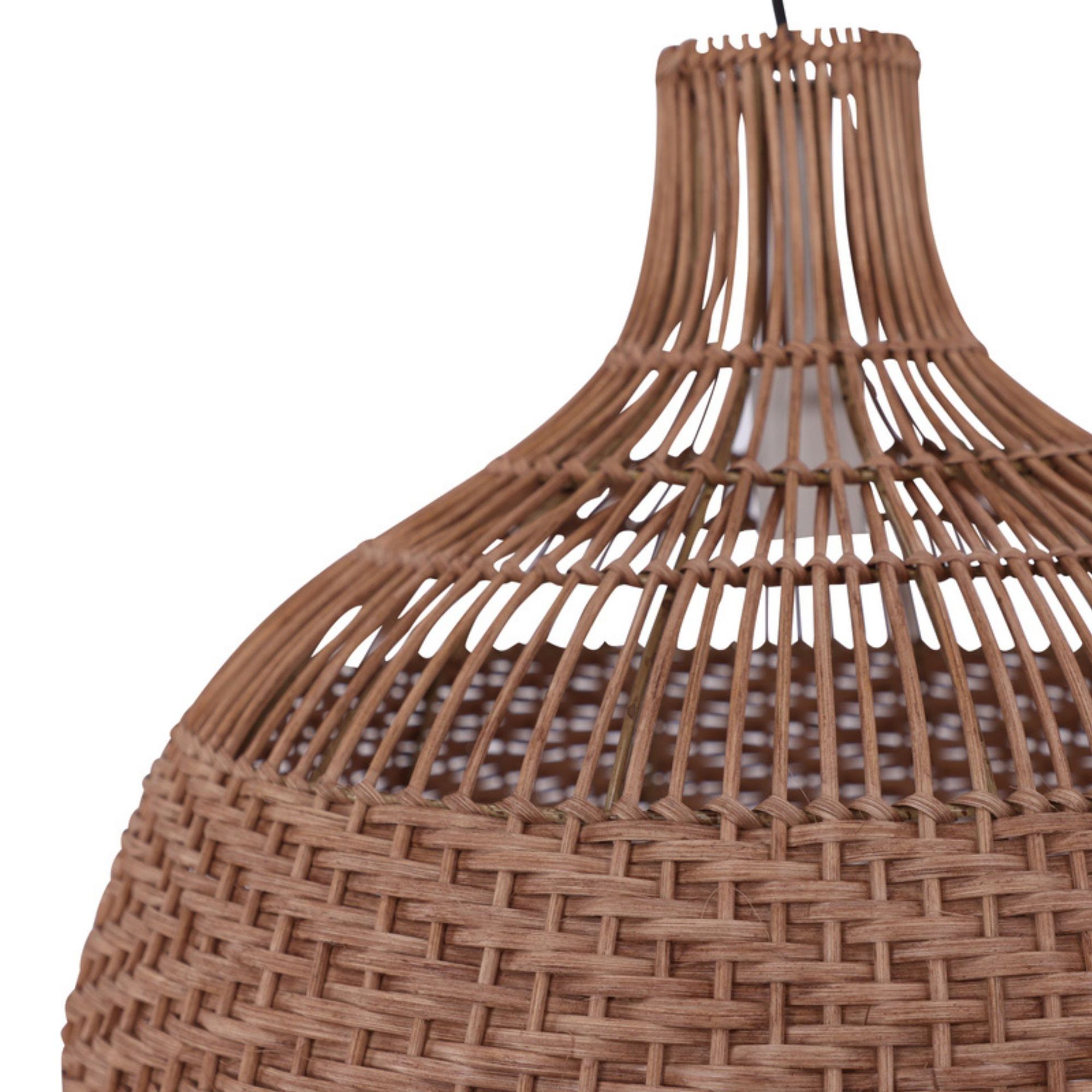 Das fein gearbeitete Geflecht sorgt für eine sanfte Lichtstreuung und schafft ein angenehmes, wohnliches Ambiente. Durch ihre großzügige Form wirkt die Leuchte präsent, ohne dominant zu sein, und unterstreicht moderne, skandinavische oder natürliche Einrichtungskonzepte.