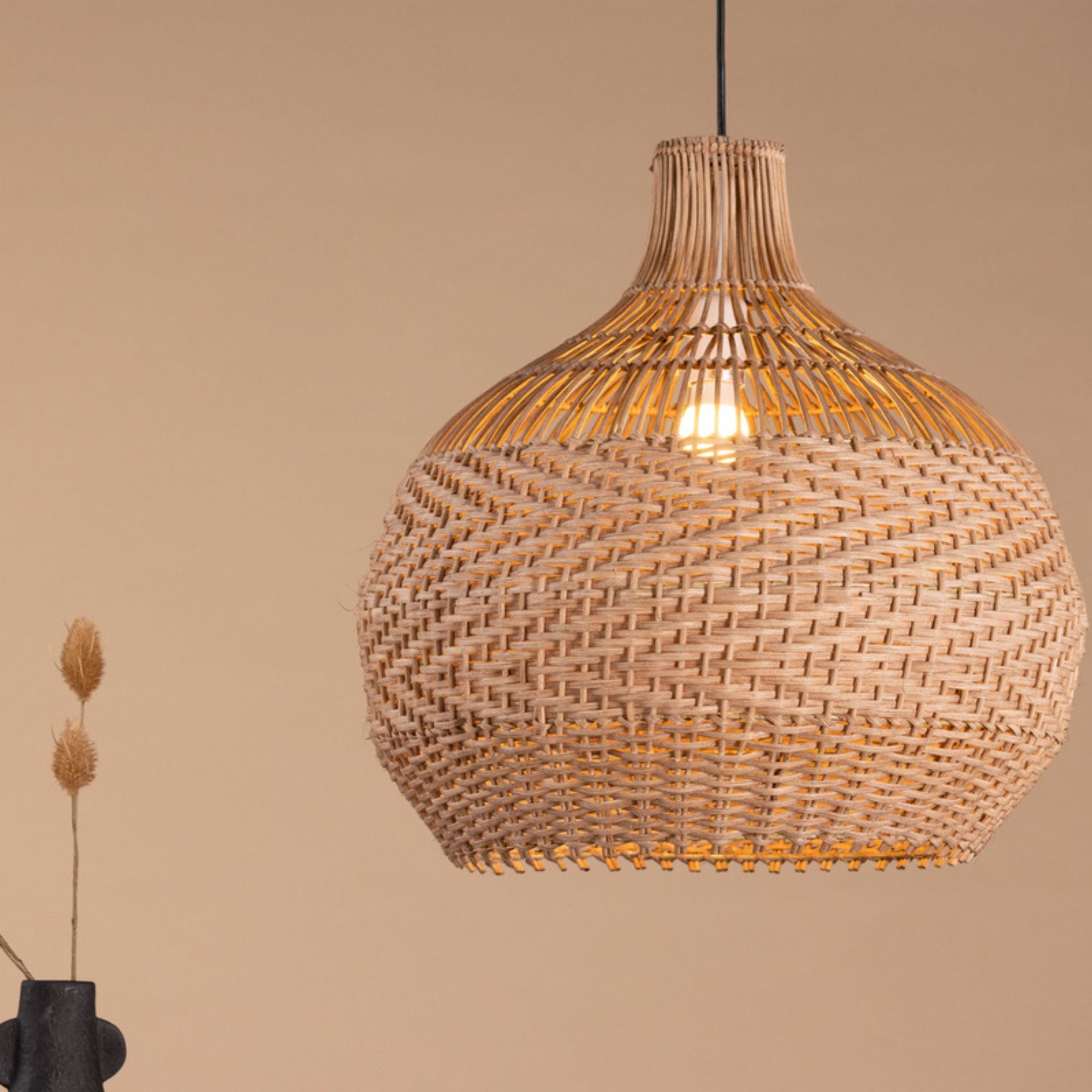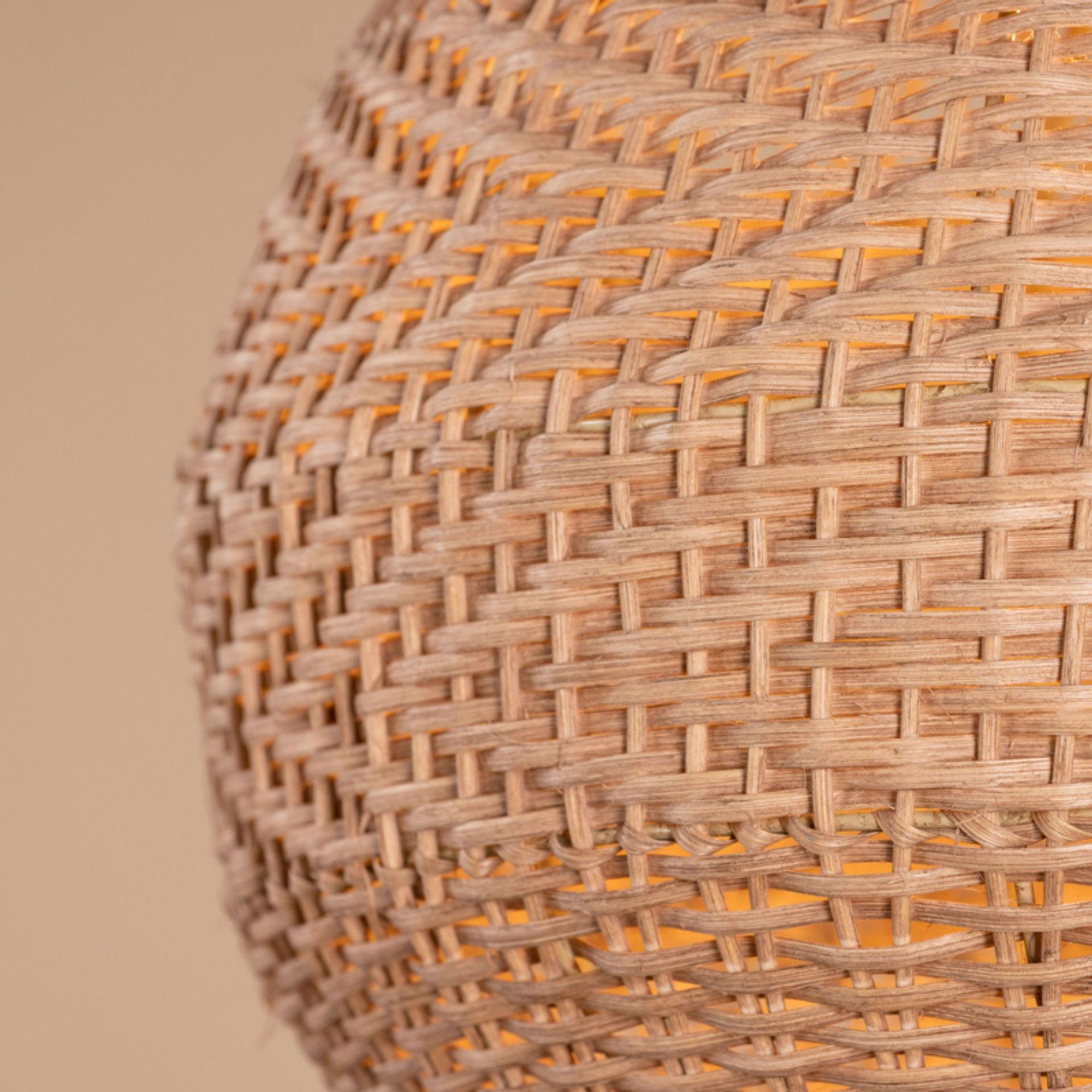 Das naturfarbene Rattan sorgt für eine sanfte Lichtstreuung und erzeugt eine warme, gemütliche Atmosphäre. Durch das feine Geflecht entsteht ein harmonisches Lichtbild.