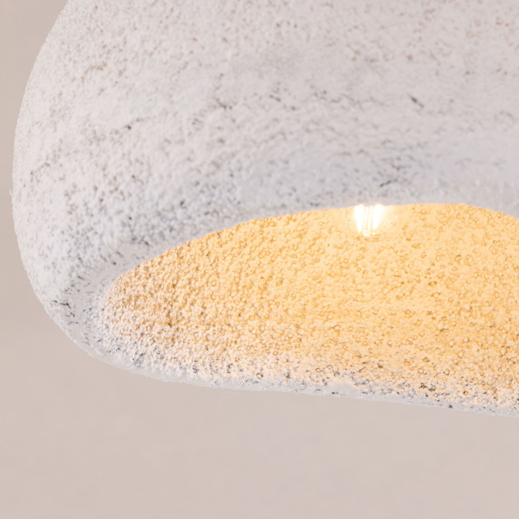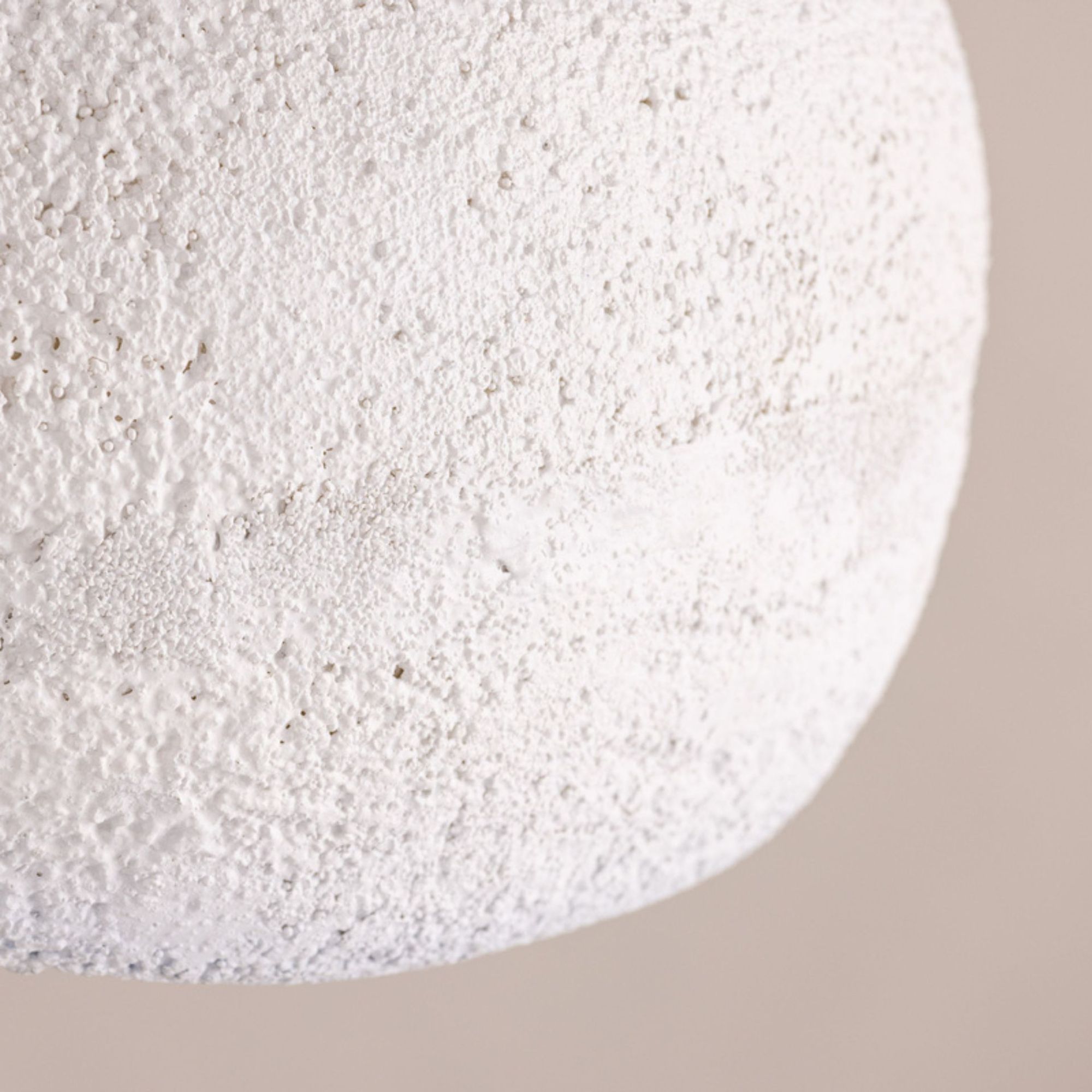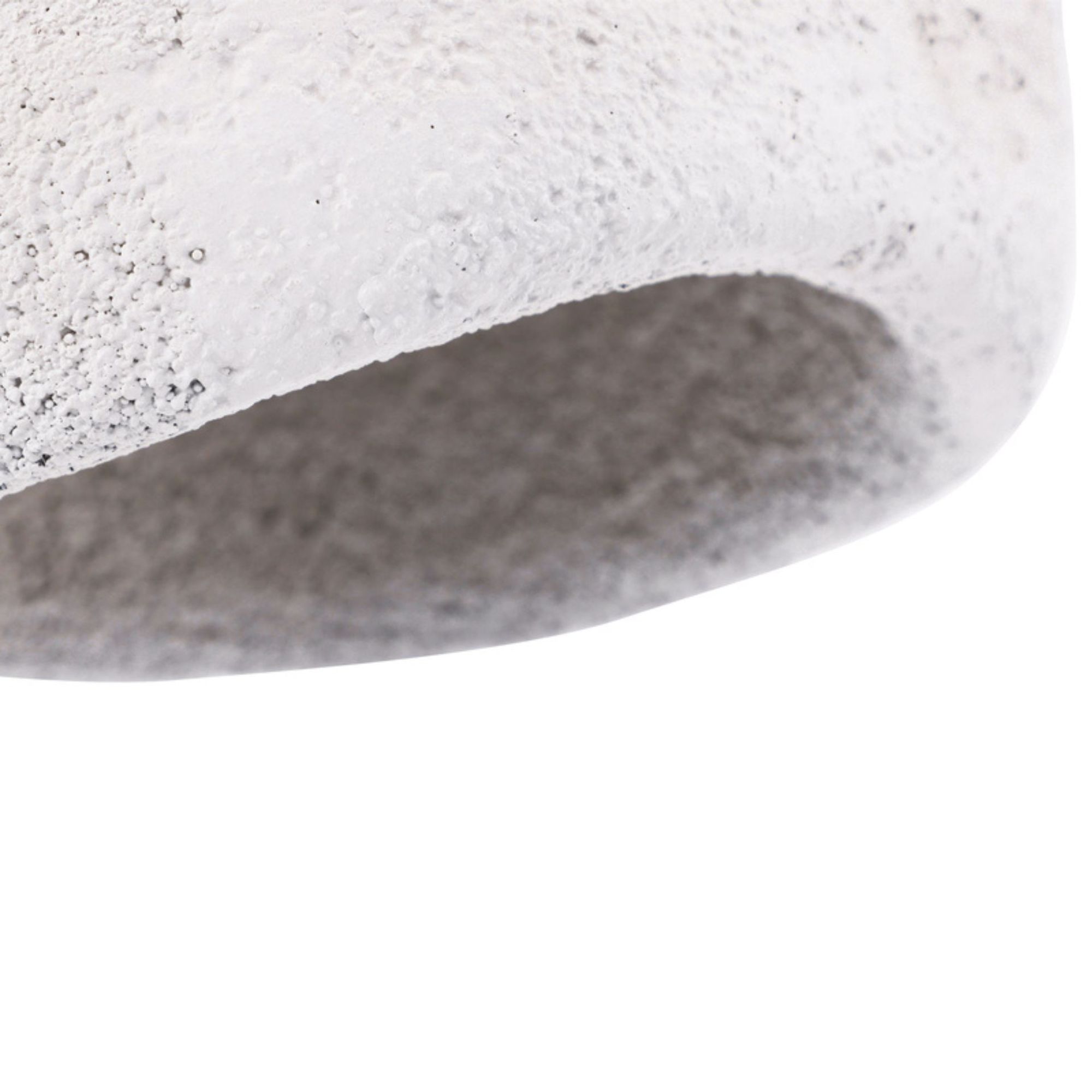 Gefertigt aus Resin erhält die Leuchte eine strukturierte, steinähnliche Anmutung, die rustikale Elemente mit modernem Design verbindet. Die helle Farbgebung sorgt für eine dezente Präsenz und fügt sich harmonisch in unterschiedliche Einrichtungsstile ein.