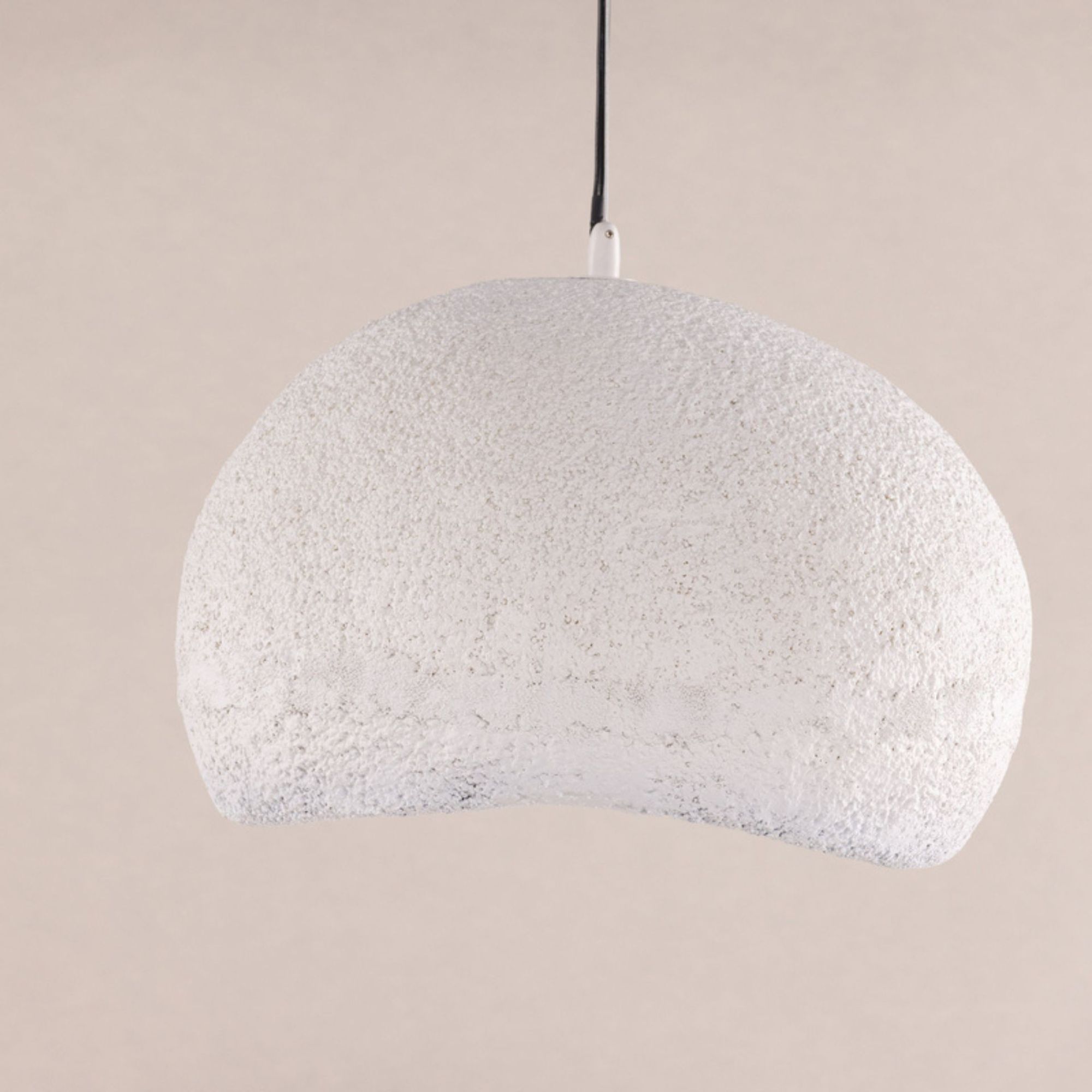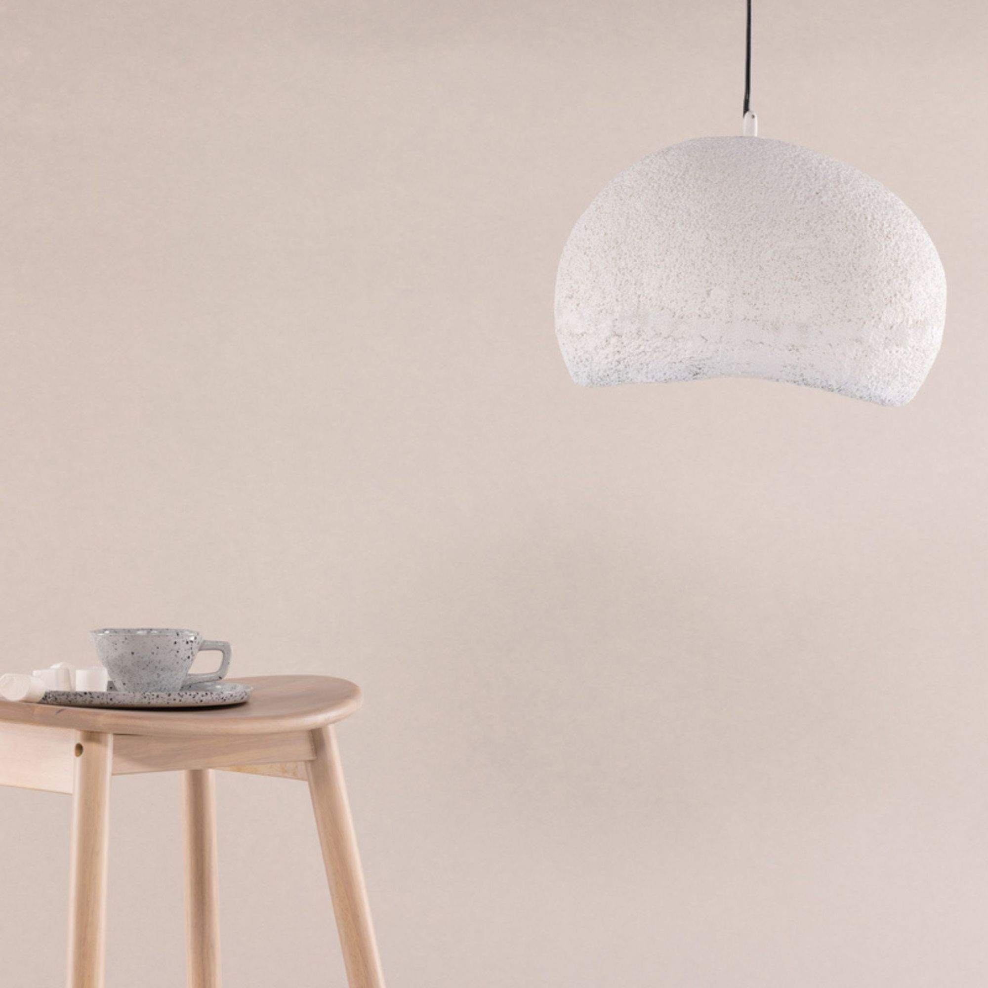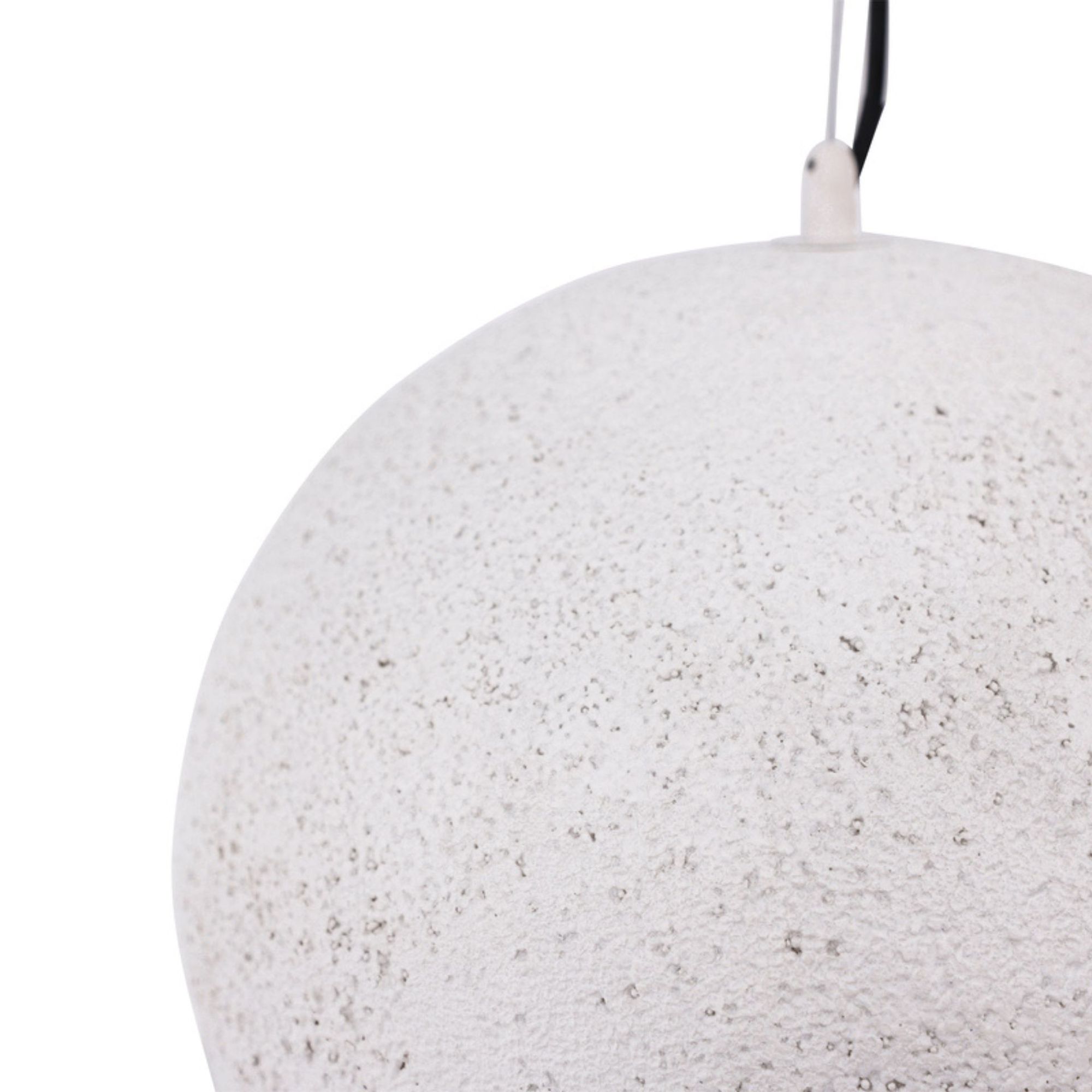 Gefertigt aus Resin erhält die Leuchte eine strukturierte, steinähnliche Anmutung, die rustikale Elemente mit modernem Design verbindet. Die helle Farbgebung sorgt für eine dezente Präsenz und fügt sich harmonisch in unterschiedliche Einrichtungsstile ein.