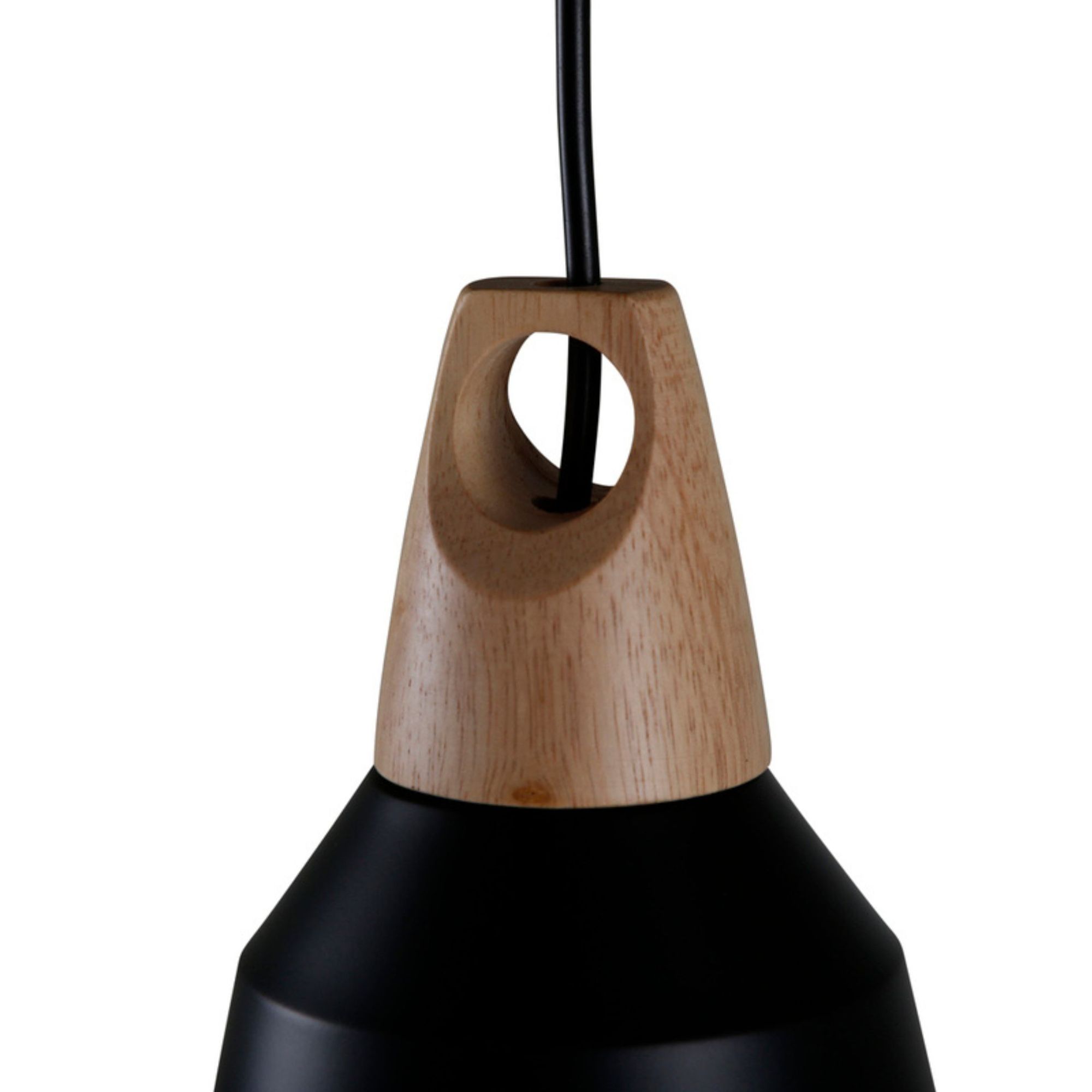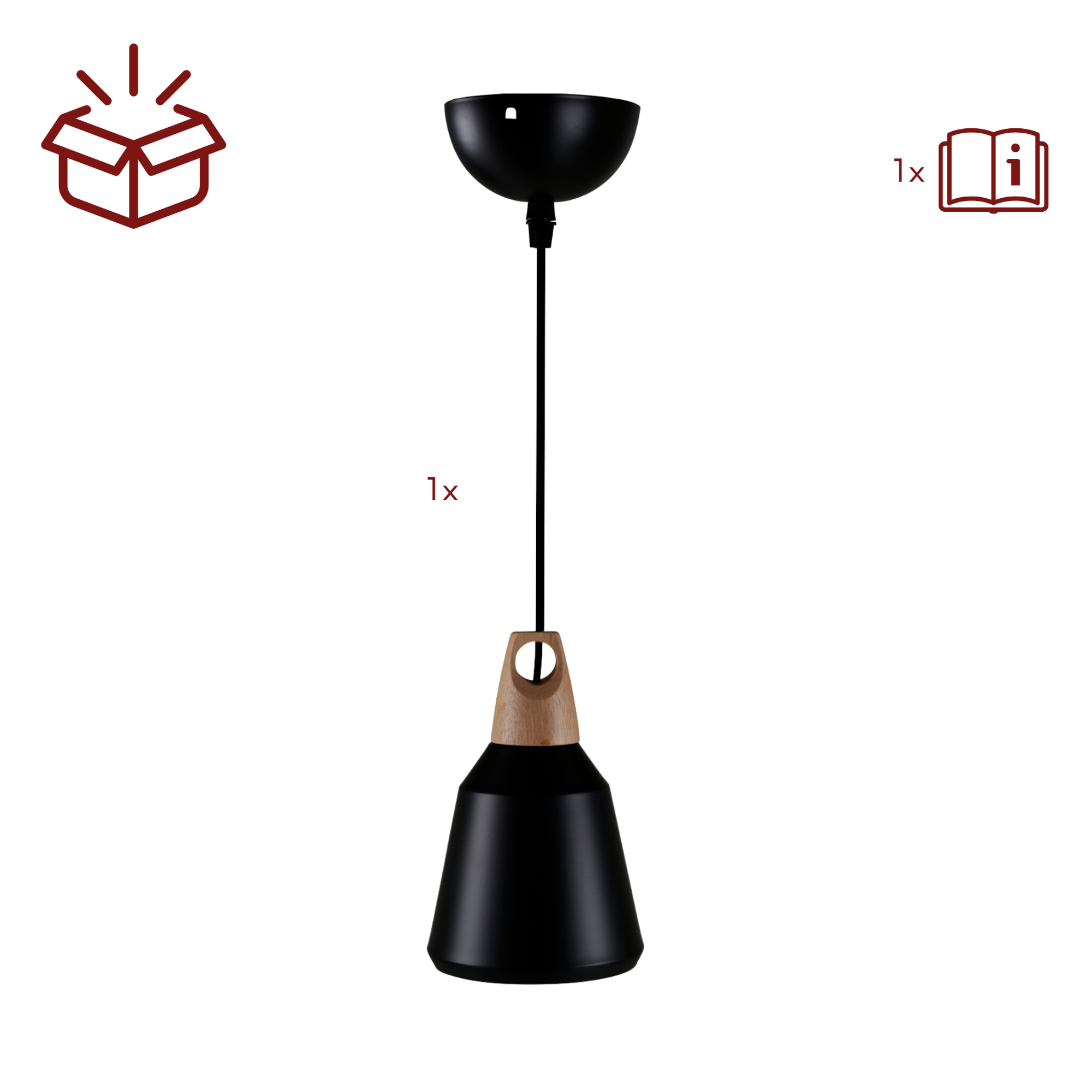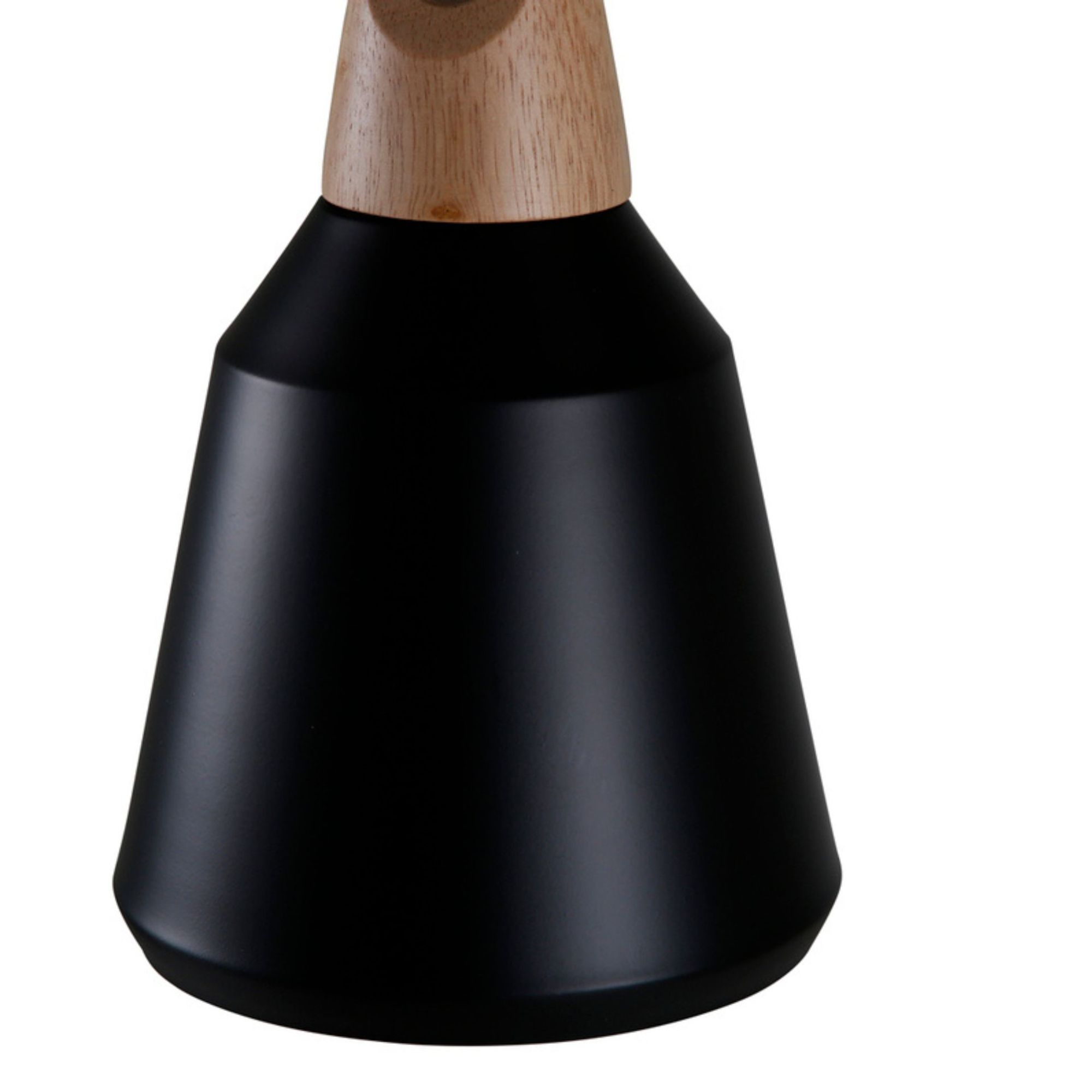 Der Lampenschirm besteht aus robustem Stahl und wird durch ein dekoratives Oberteil in Holzoptik ergänzt. Diese Kombination aus klaren Linien und natürlichen Elementen verleiht der Leuchte eine besonders elegante Wirkung.