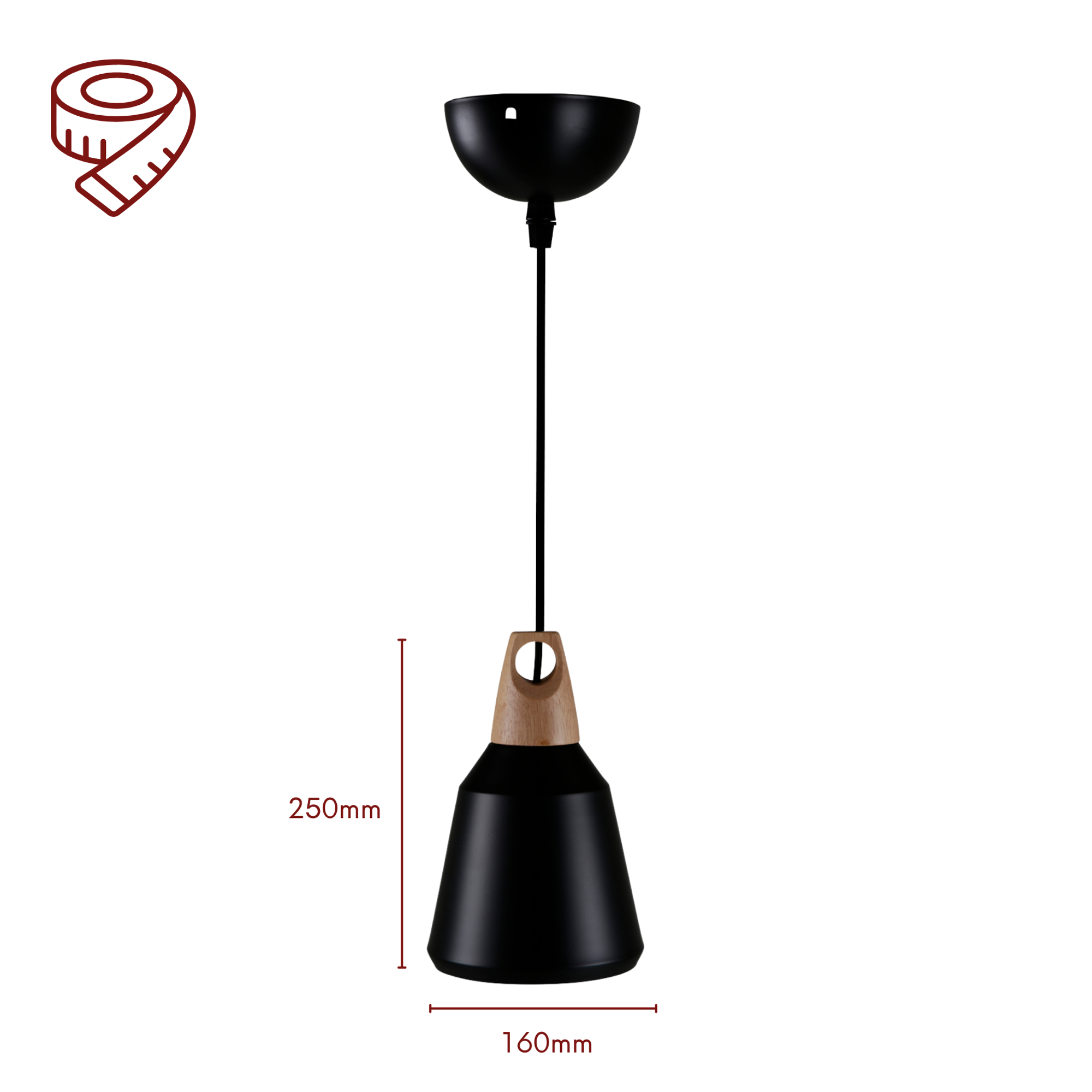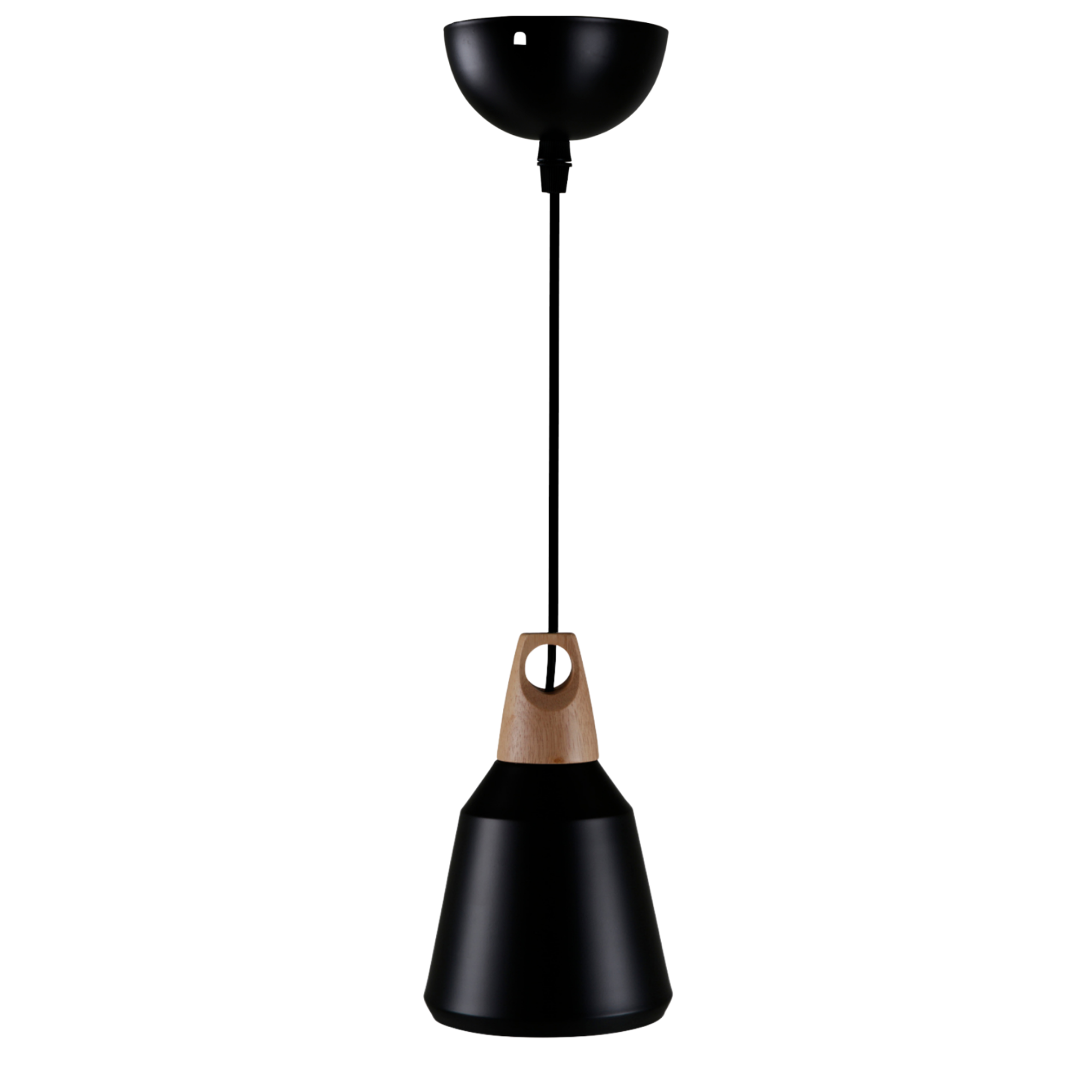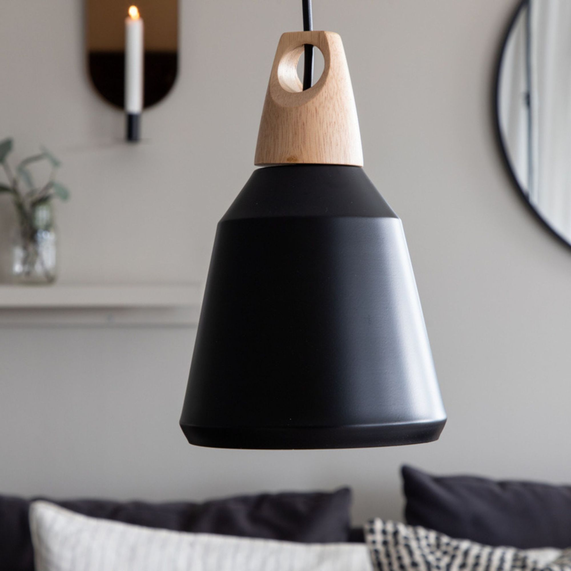 Der Lampenschirm besteht aus robustem Stahl und wird durch ein dekoratives Oberteil in Holzoptik ergänzt. Diese Kombination aus klaren Linien und natürlichen Elementen verleiht der Leuchte eine besonders elegante Wirkung.