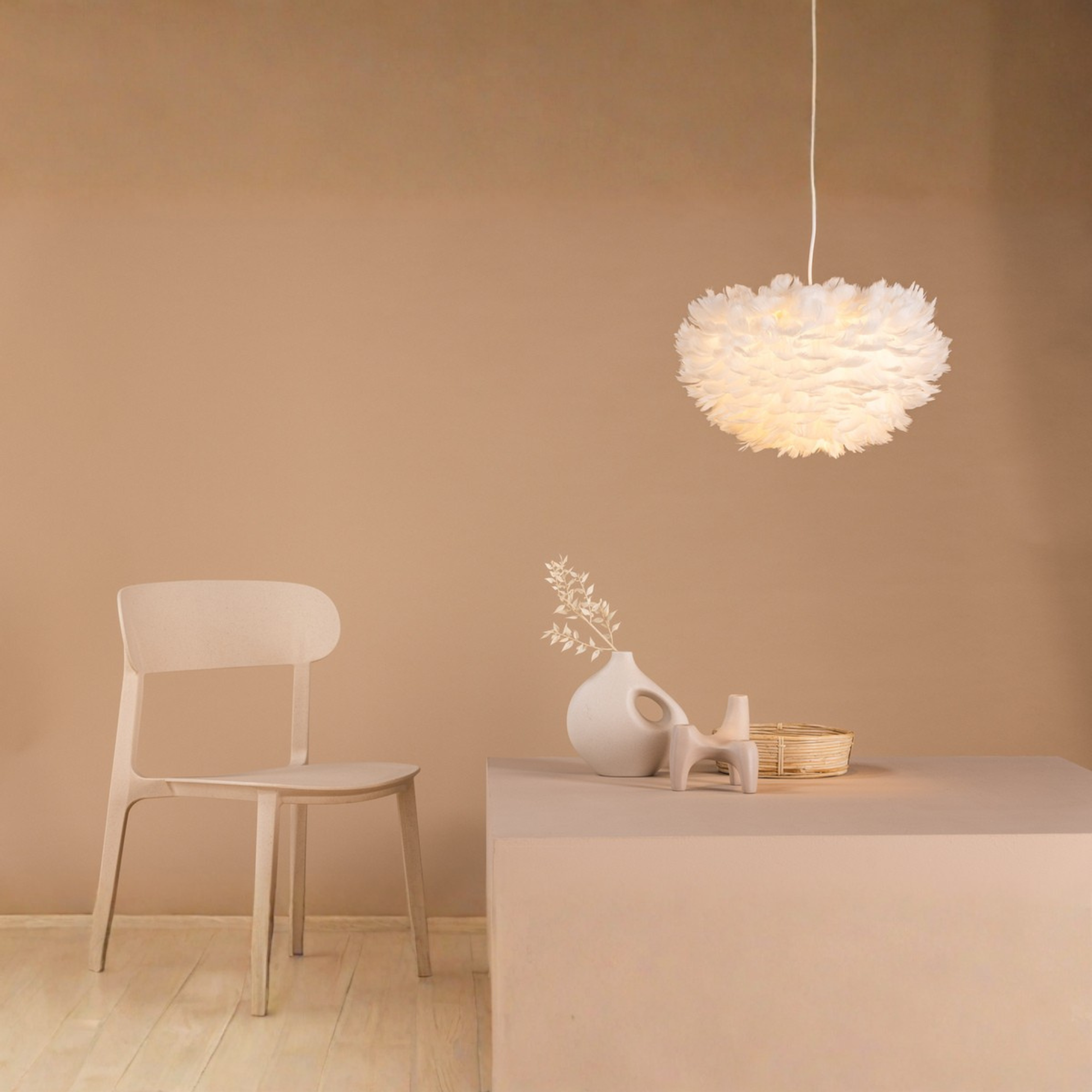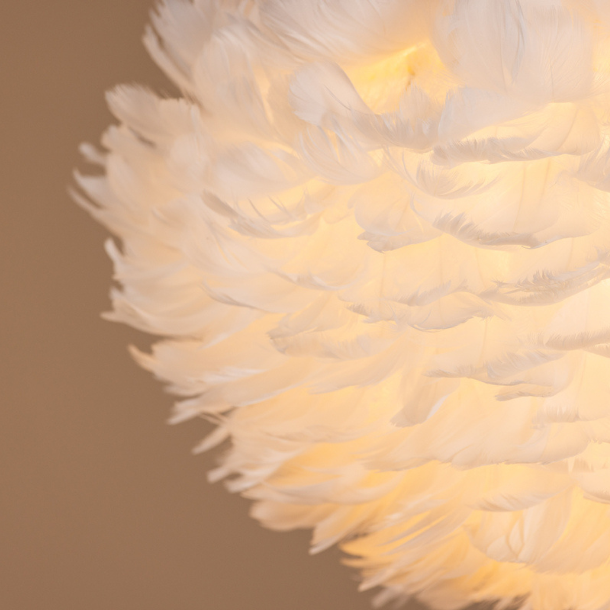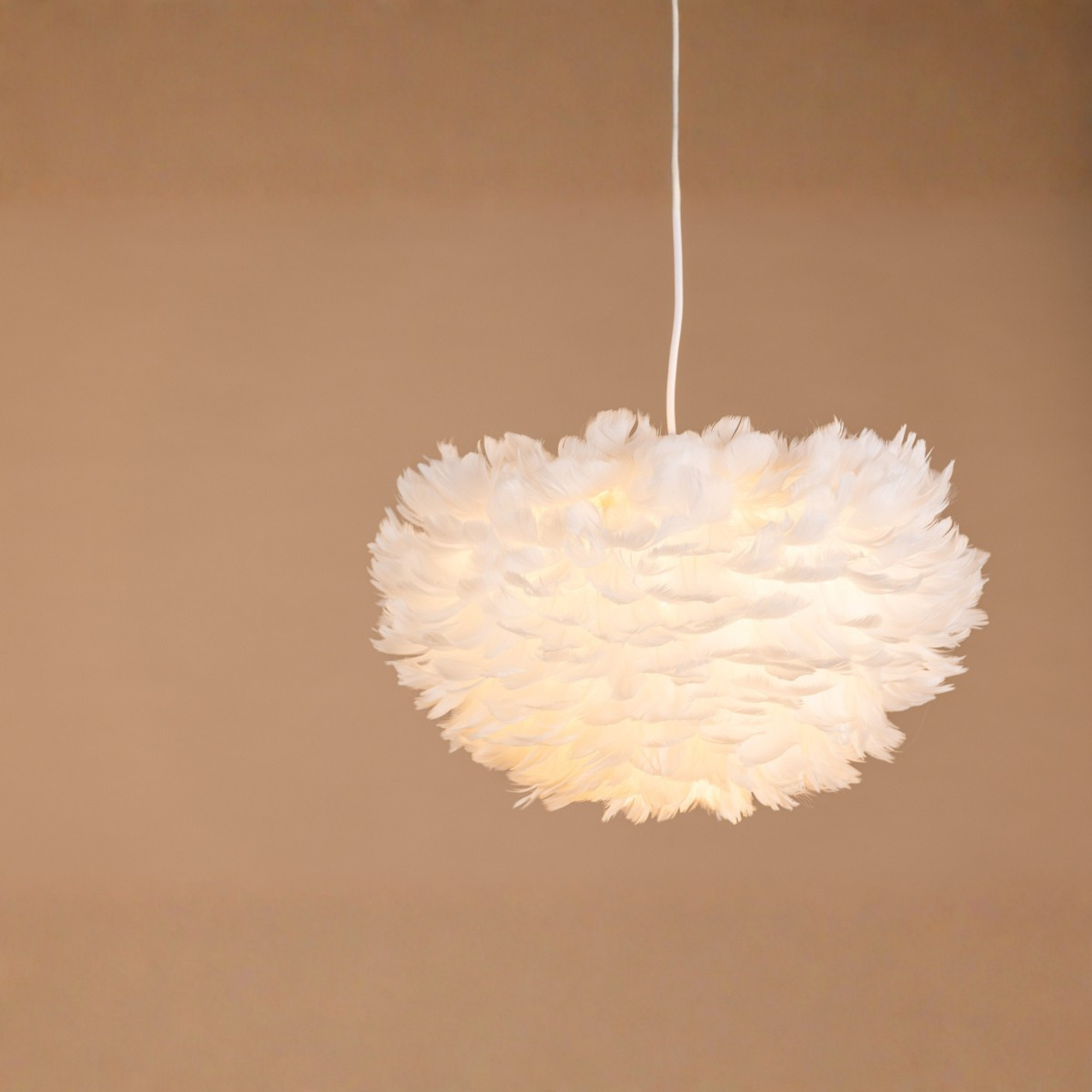 Das Licht wird durch die feine Struktur der Federn sanft gestreut und erzeugt eine warme und gemütliche Atmosphäre. Dadurch eignet sich die Leuchte ideal für Schlafzimmer oder Wohnzimmer.