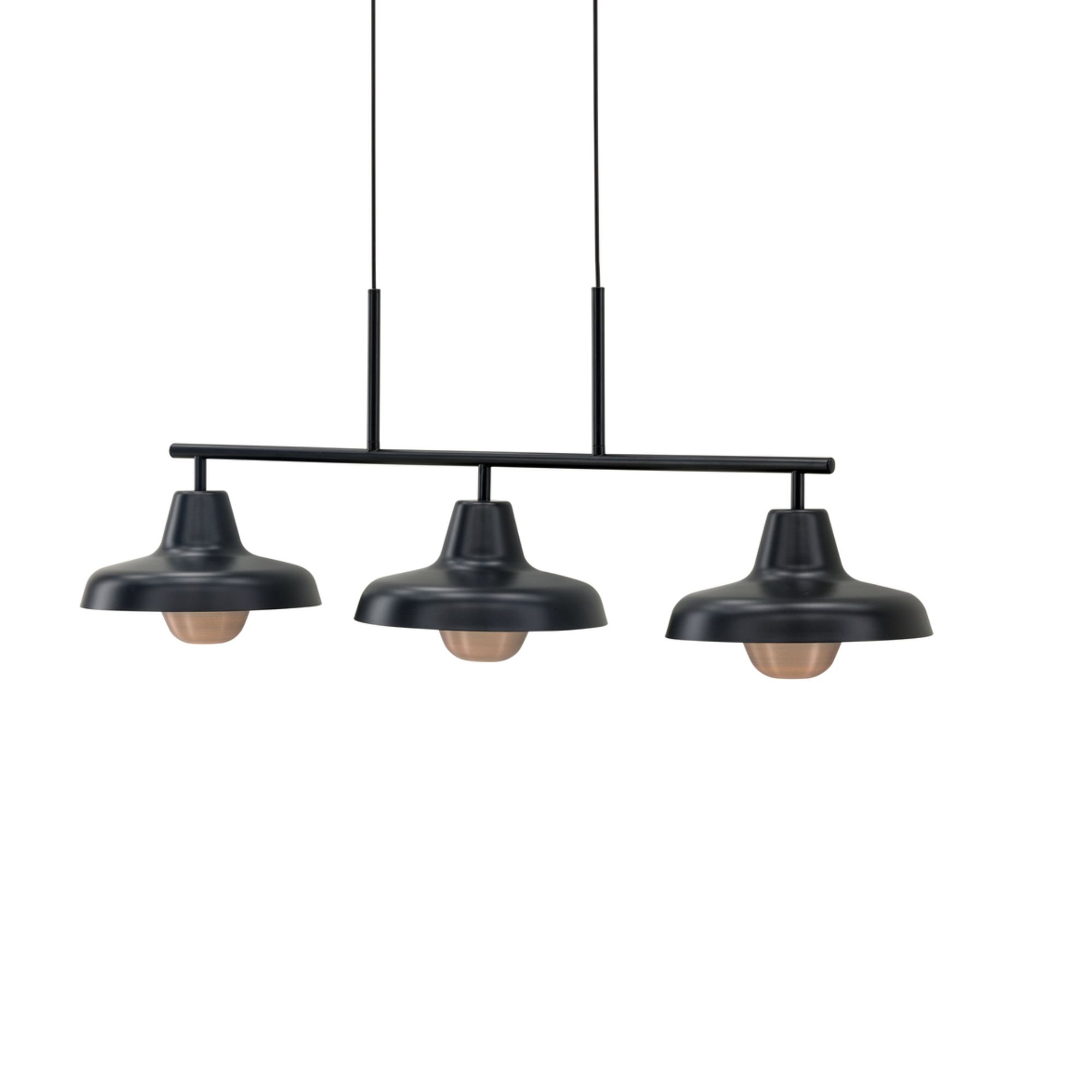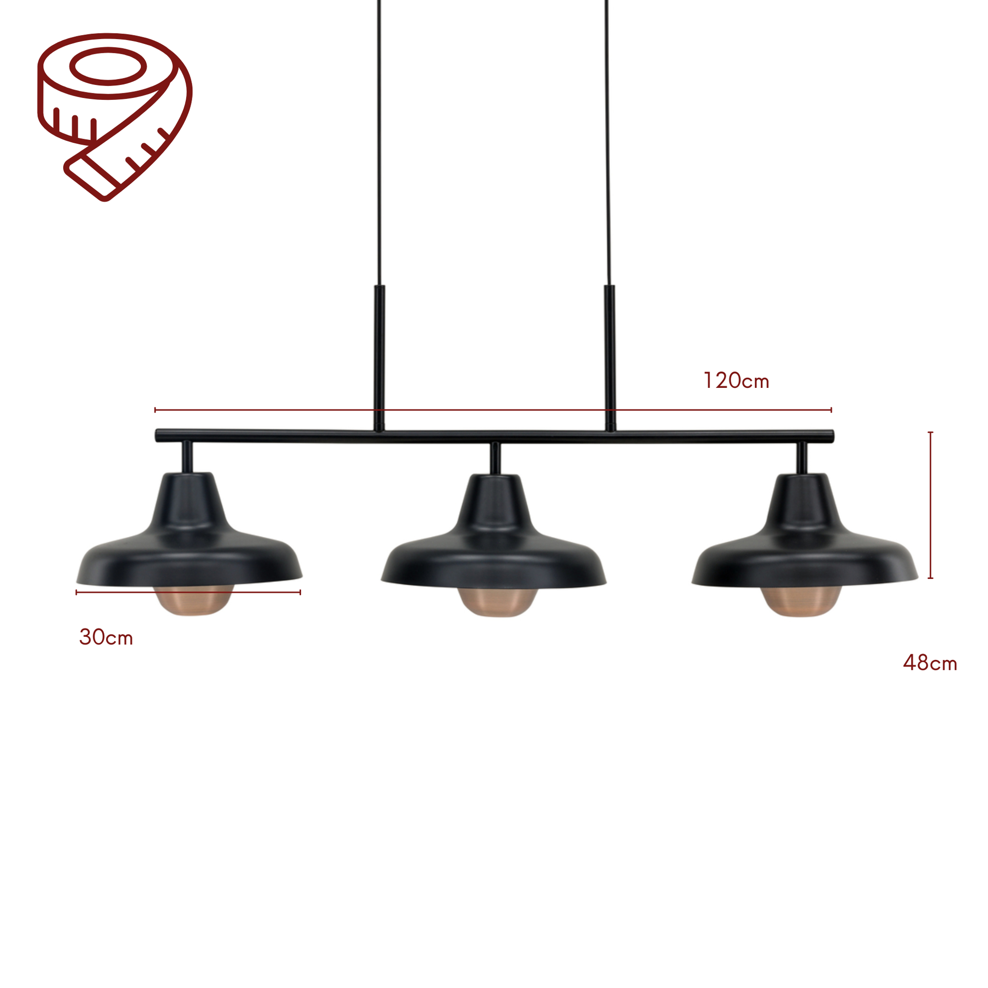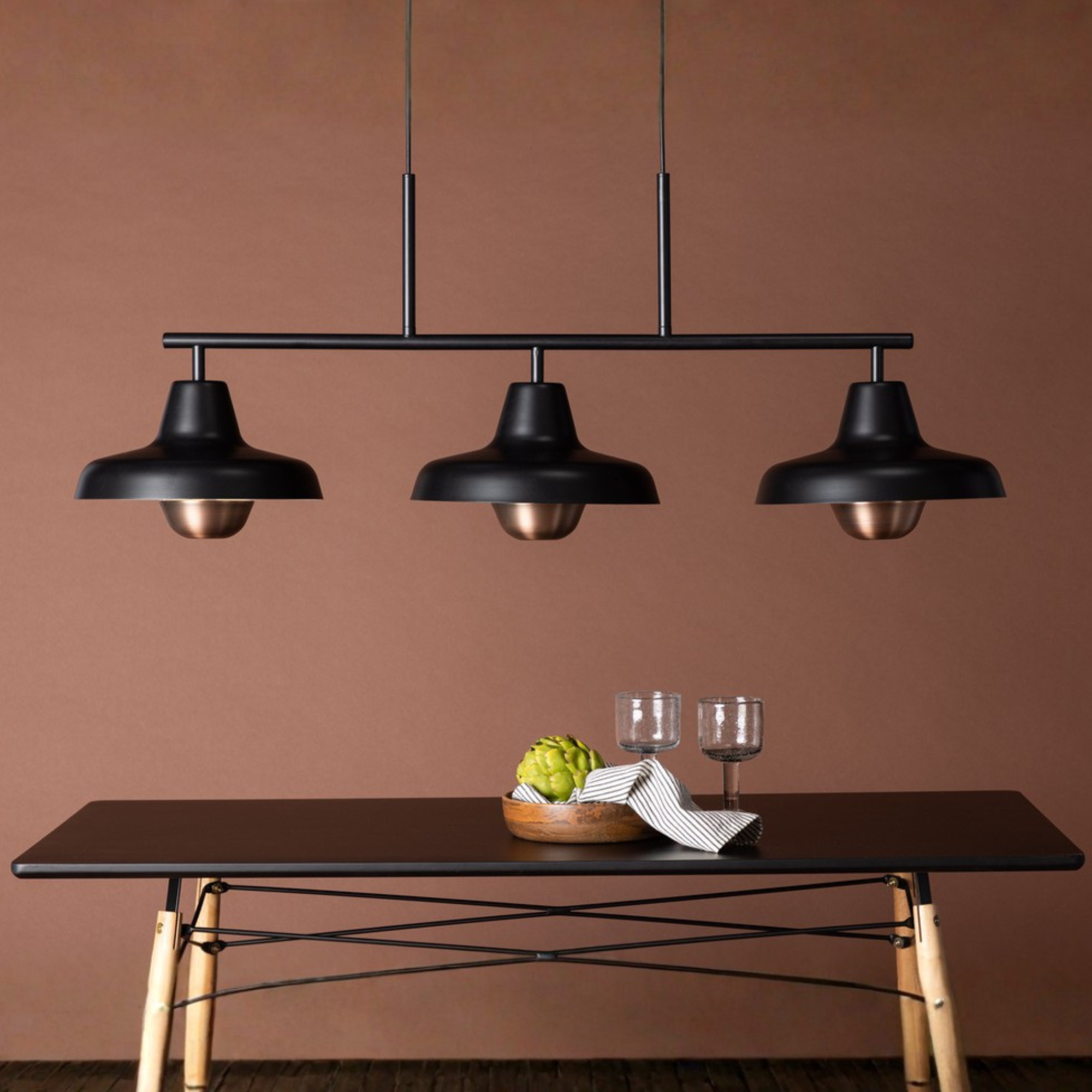 kalb | Pendelleuchte Stöten in Schwarz mit Kupferakzent dreiflammig 48 x 112 x 30 cm