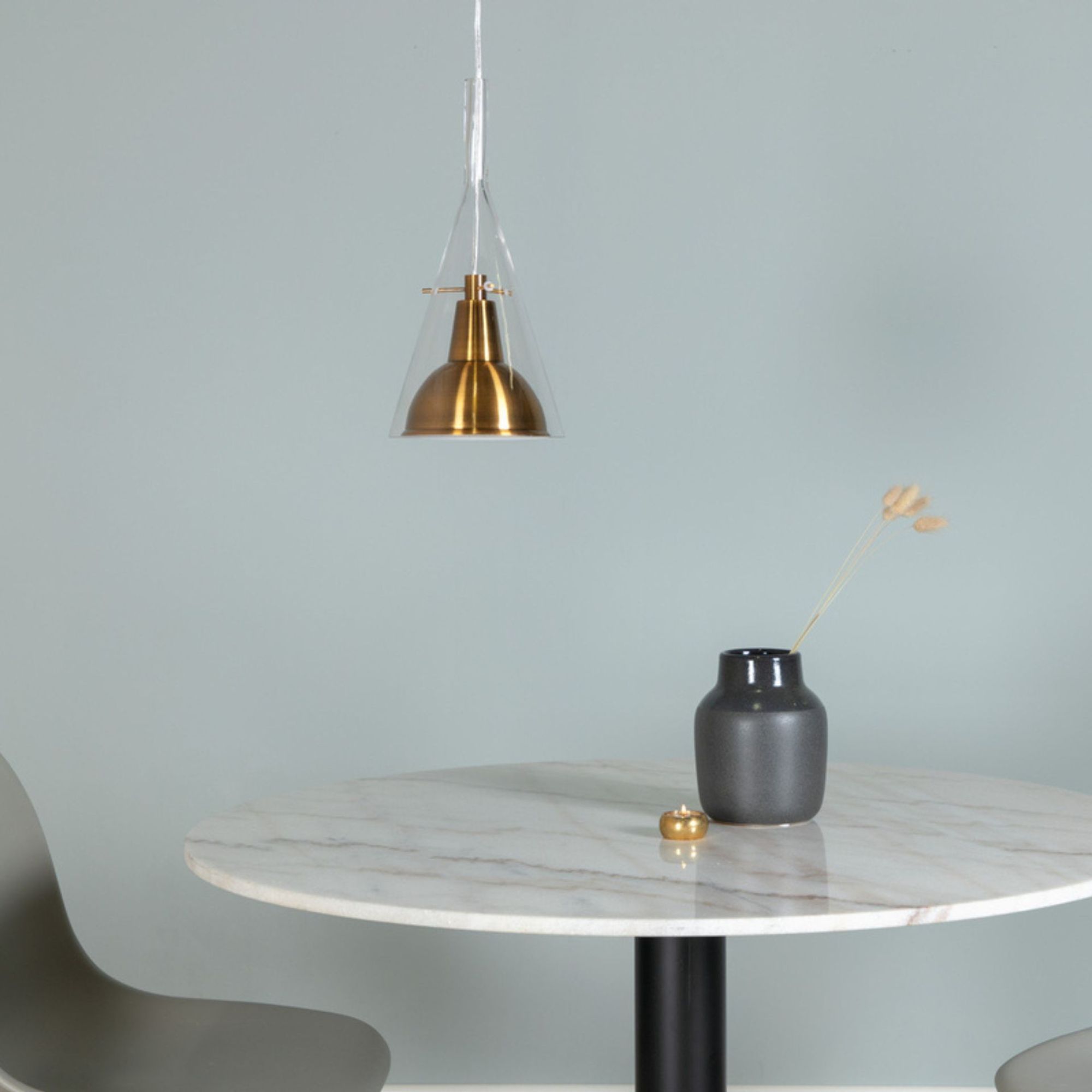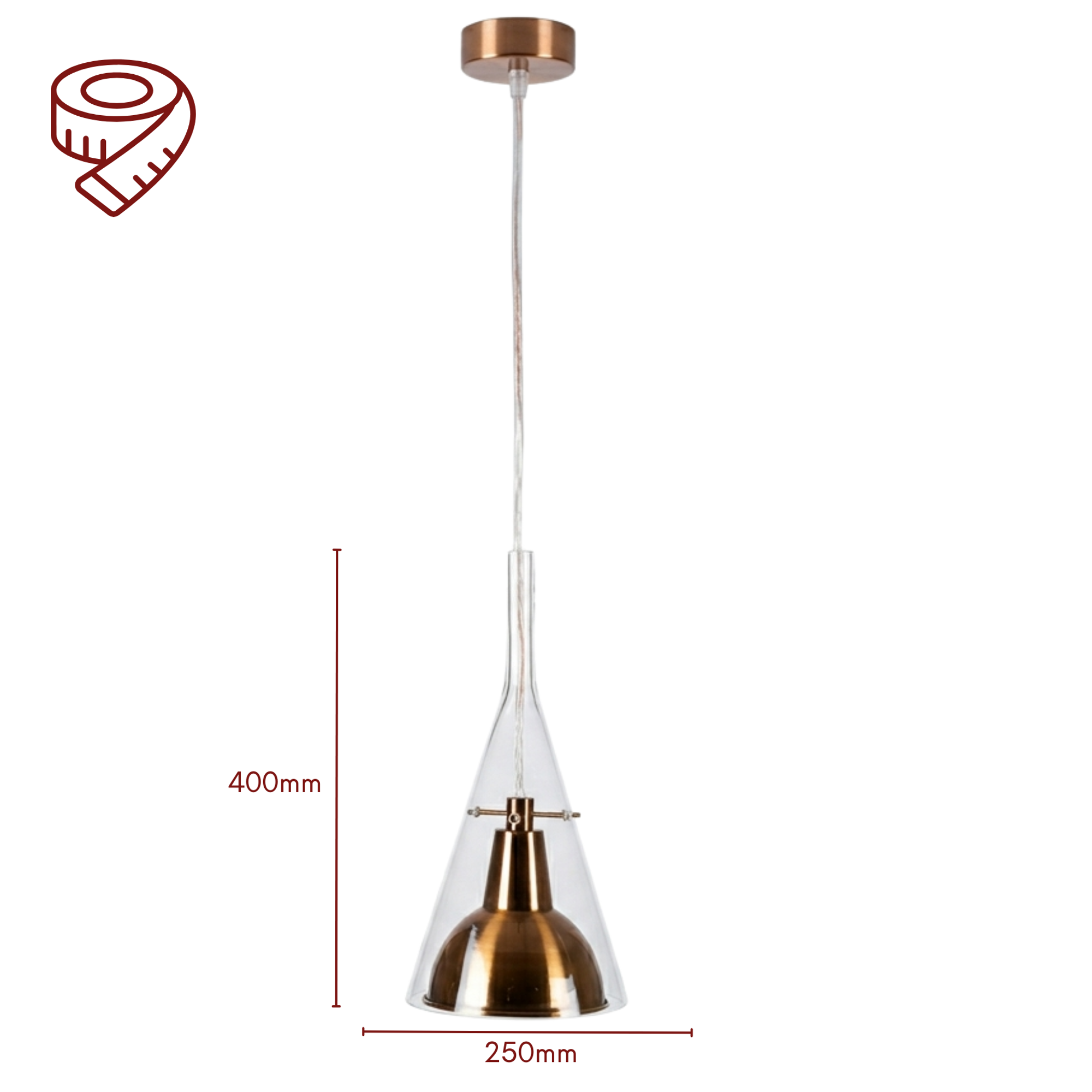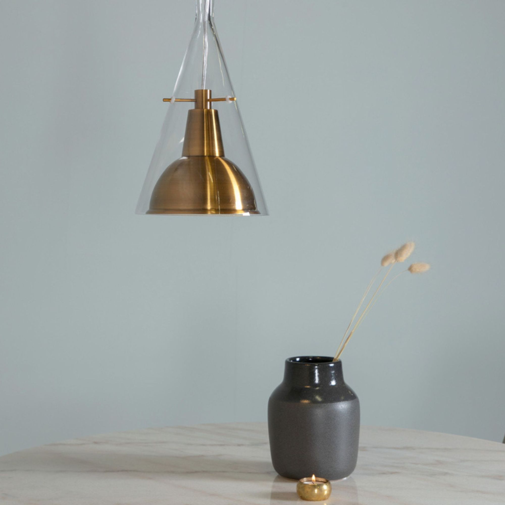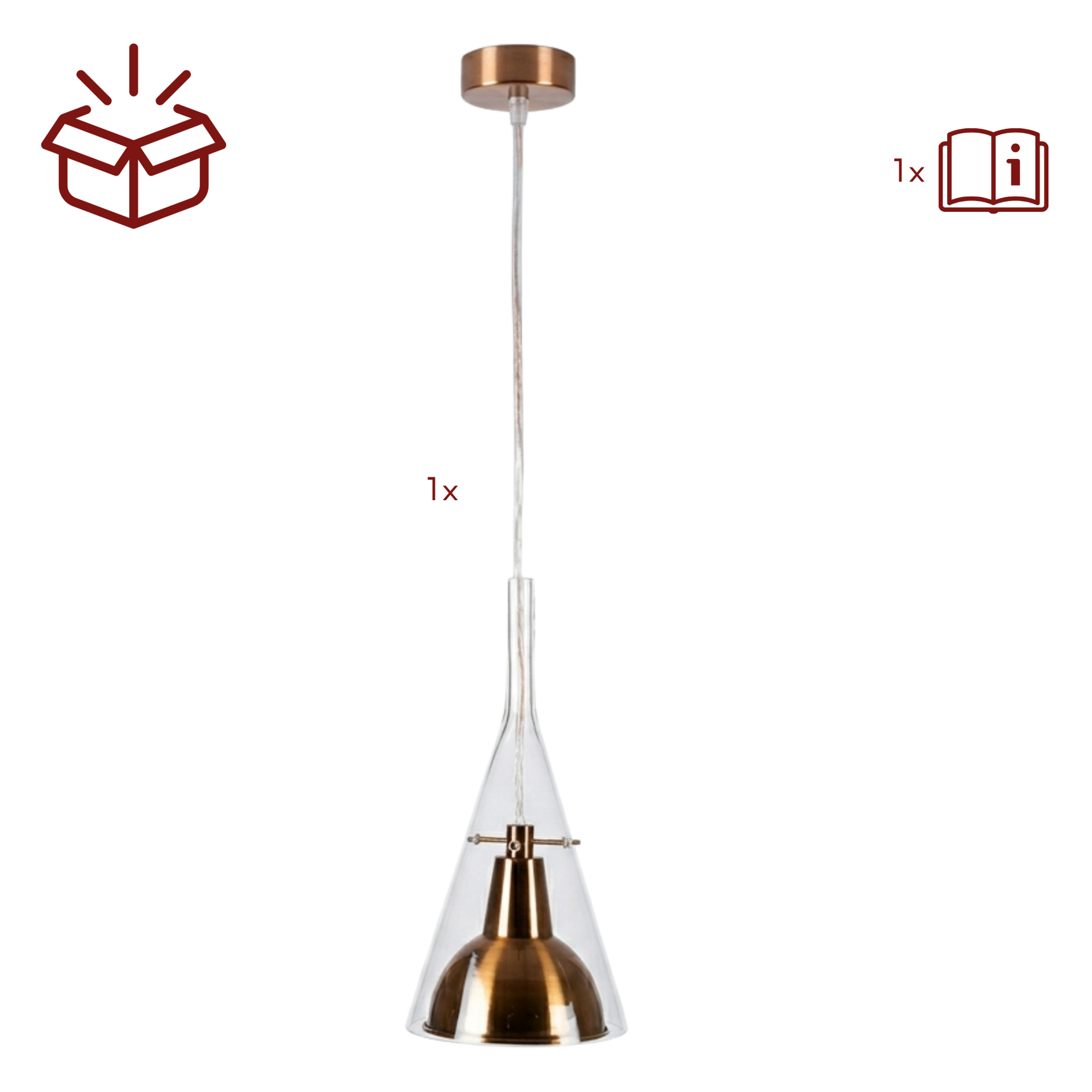Die Kombination aus klarem Glas und warmem Metallton sorgt für eine elegante Lichtwirkung und verleiht dem Raum eine angenehme, stilvolle Atmosphäre. Gleichzeitig bleibt das Design schlicht und zeitlos, sodass sich die Leuchte harmonisch in verschiedenste Wohnstile einfügt.