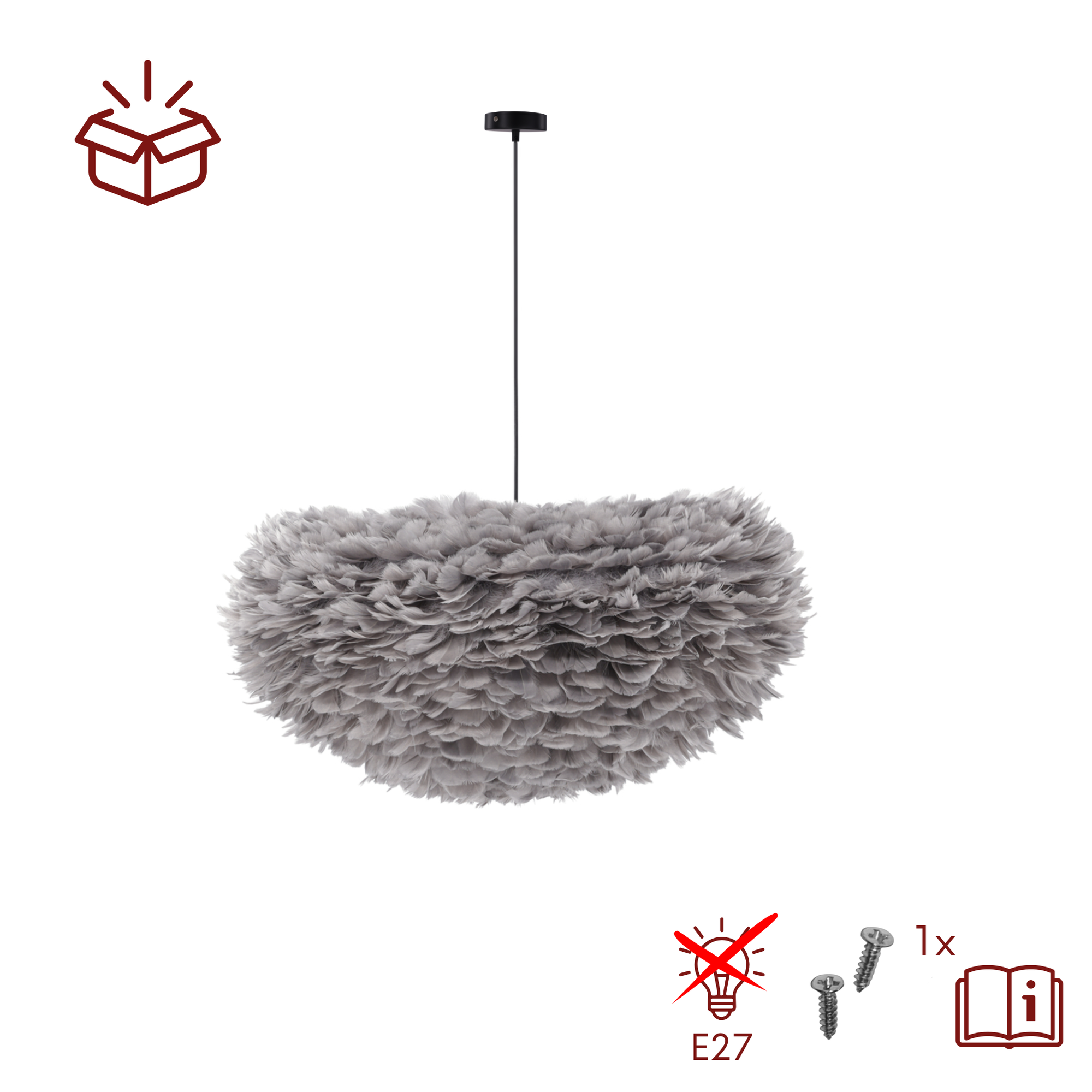 Die Nicola Deckenleuchte ist vegan und tierfrei. Der Lampenschirm besteht aus hochwertigen Kunstfedern und kommt vollständig ohne echte Federn aus. Die Leuchte ist mit einer E27 Fassung (Leuchtmittel nicht im Lieferumfang enthalten) ausgestattet. Dadurch können Sie die Lichtfarbe und Lichtstimmung individuell über das eingesetzte Leuchtmittel bestimmen. So lässt sich die Beleuchtung optimal an Ihre persönlichen Wohnbedürfnisse anpassen.
