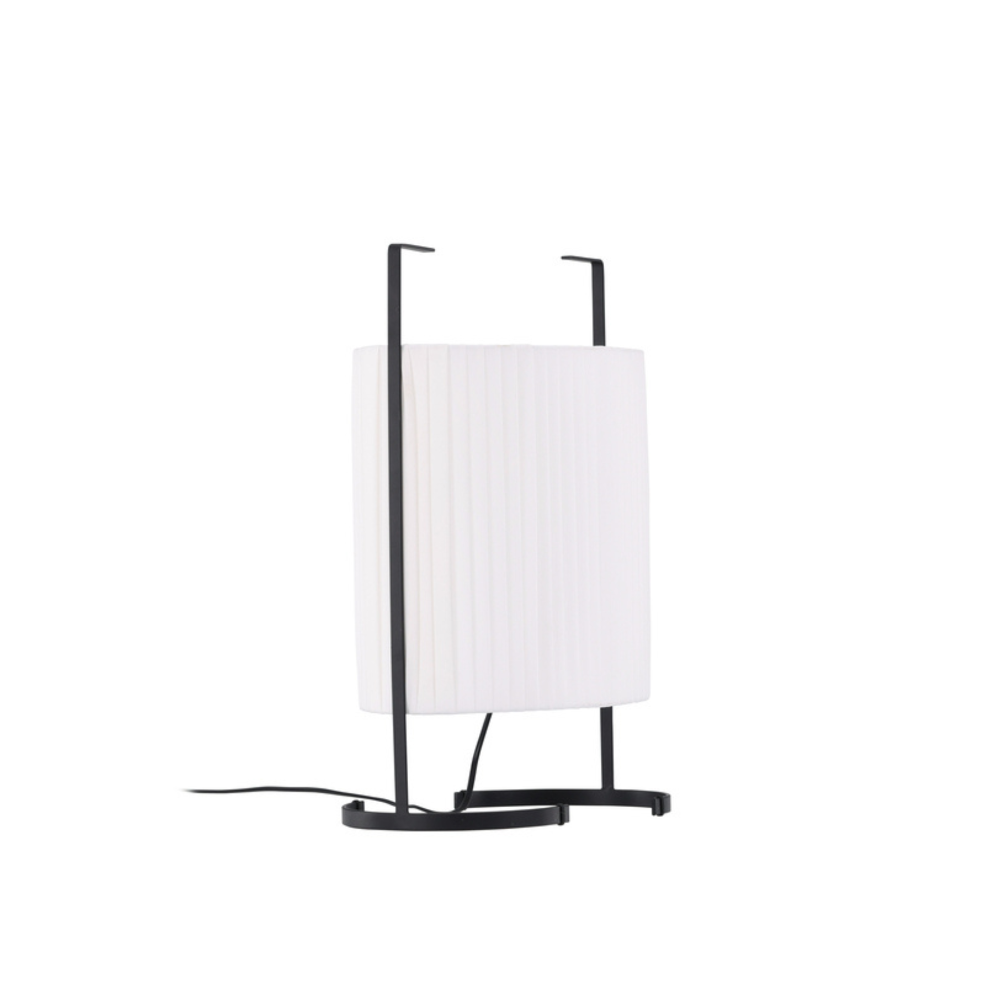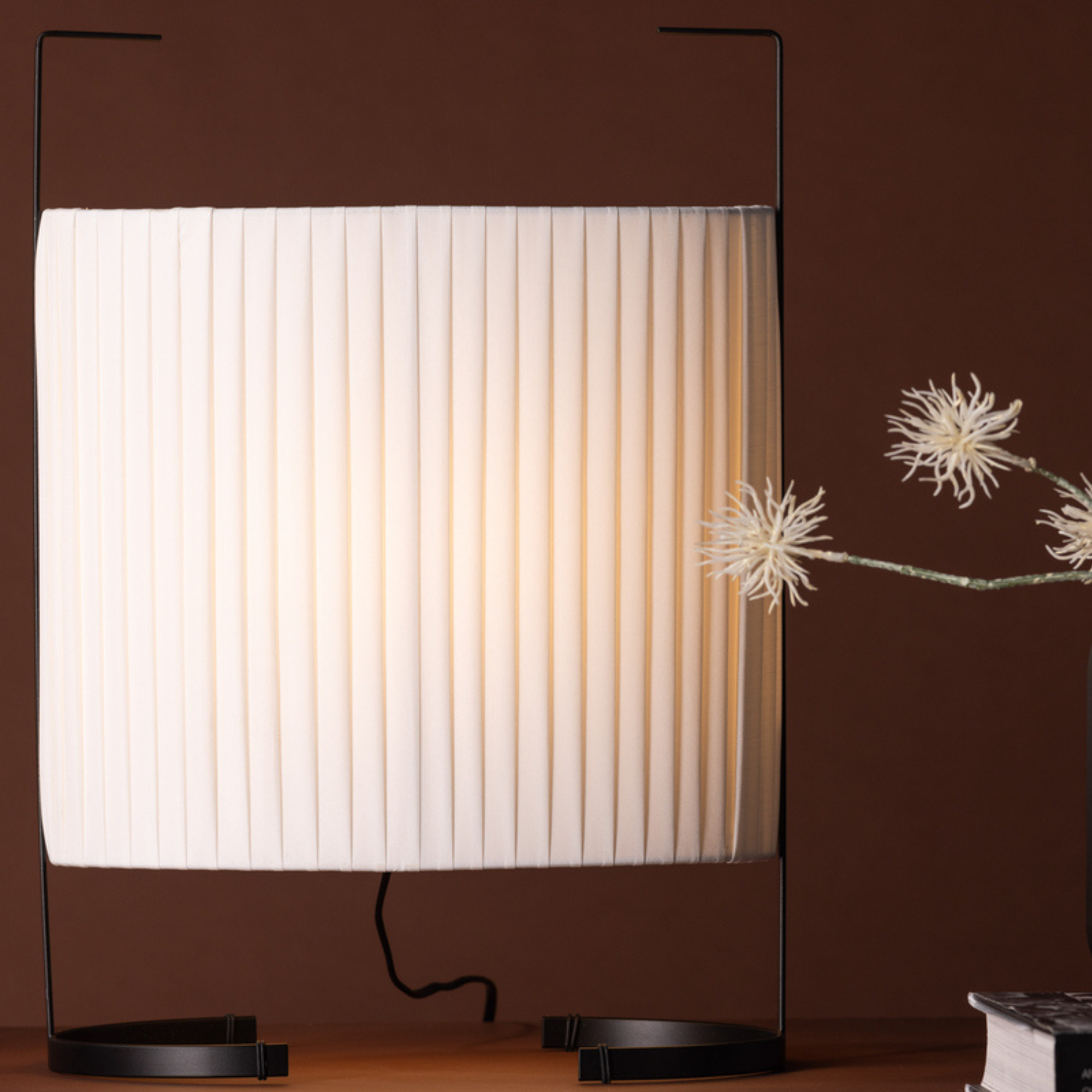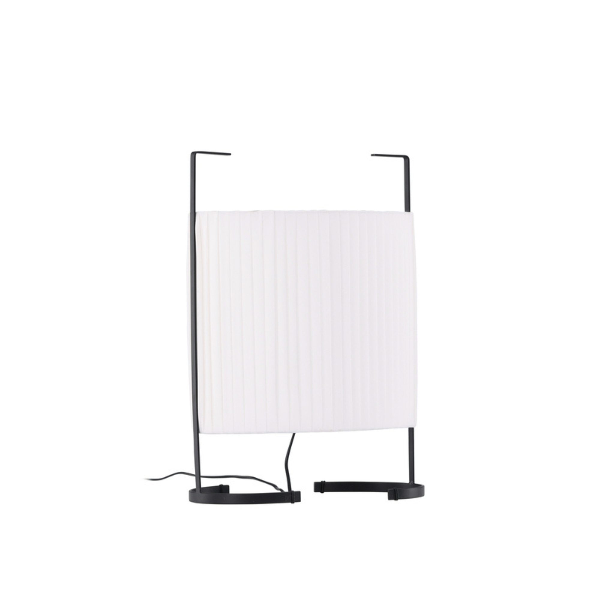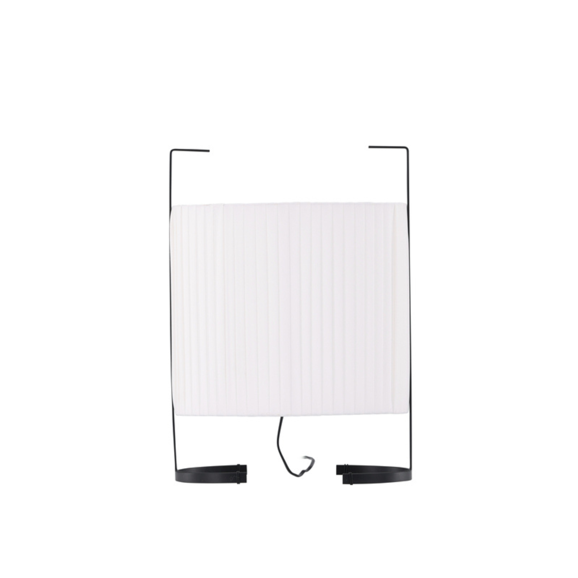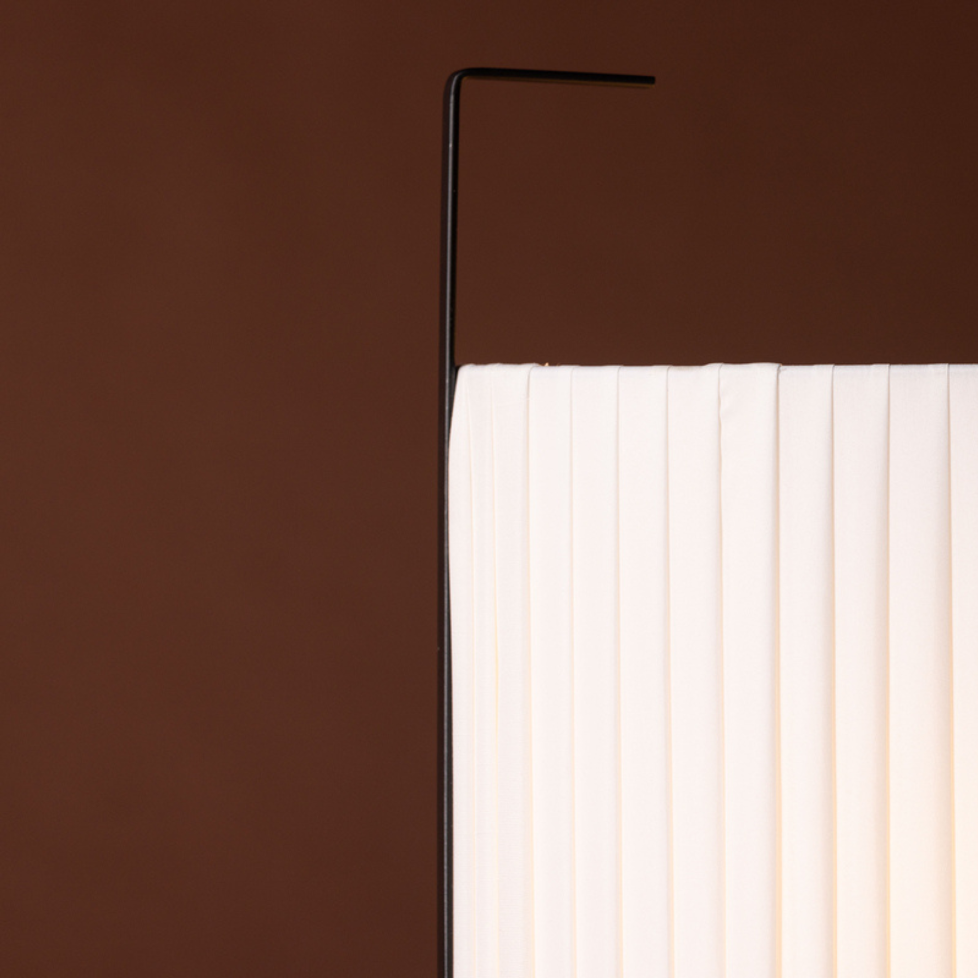 Das Gestell besteht aus Metall, während der Lampenschirm aus Stoff gefertigt ist.