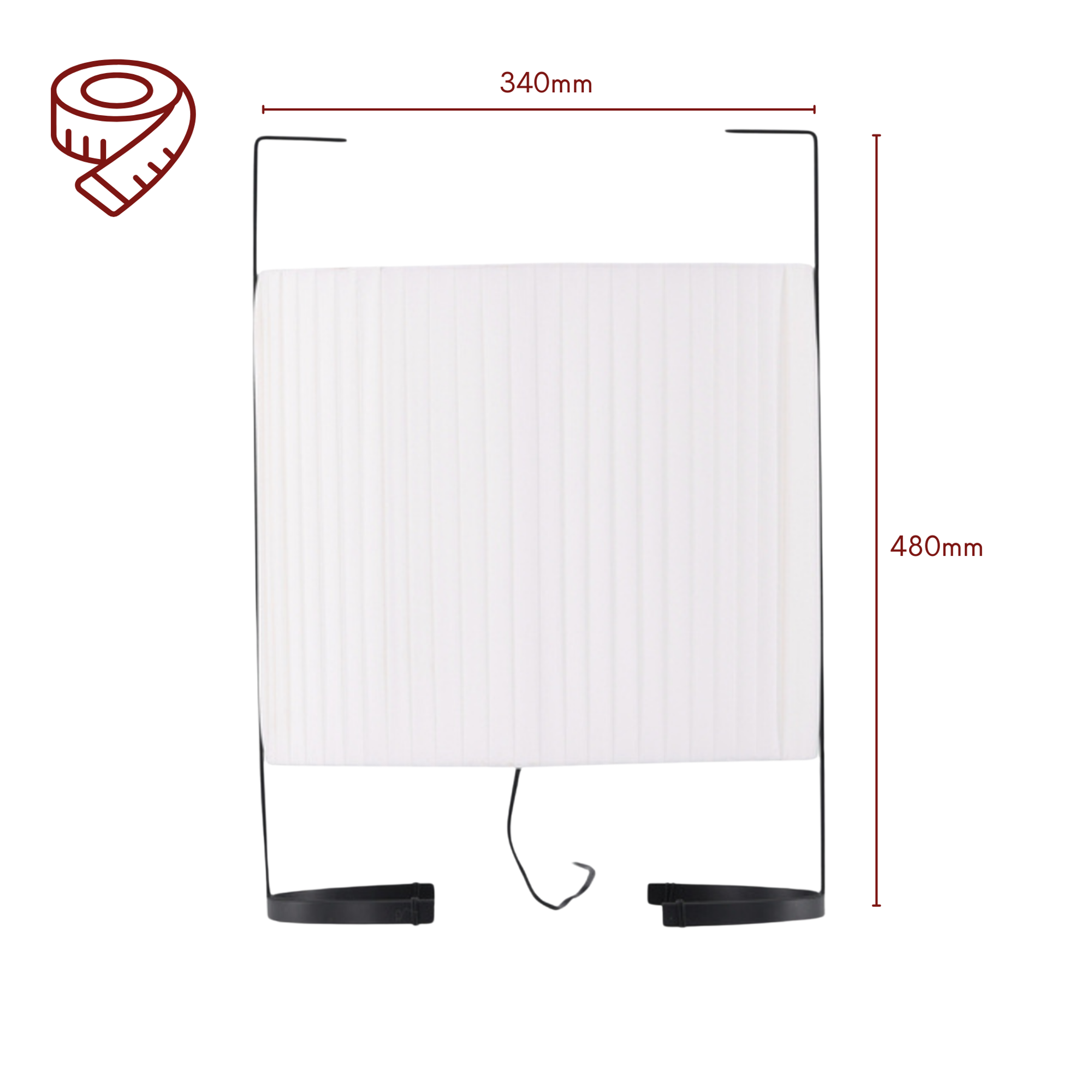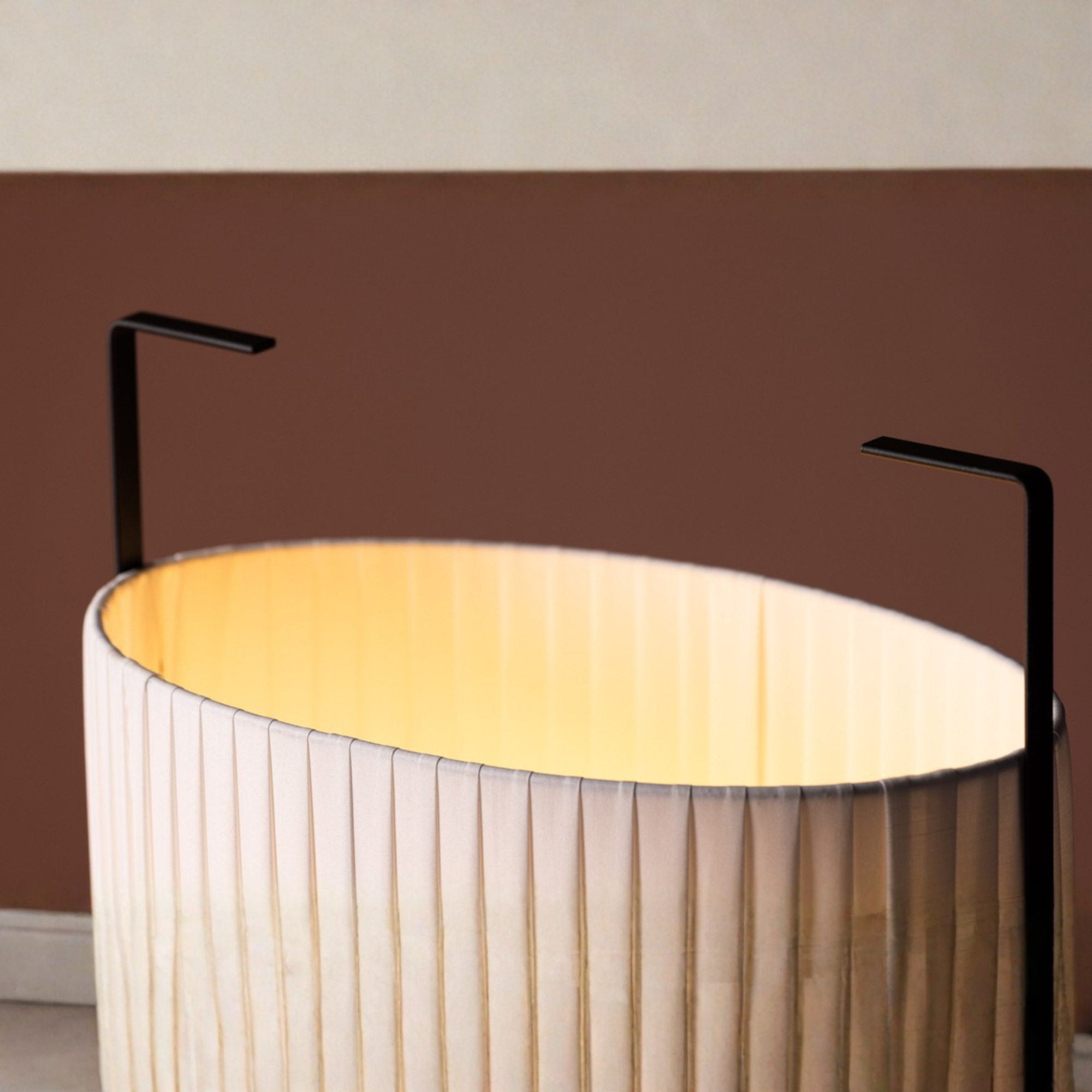 Das stabile Metallgestell steht auf dekorativ geformten Standfüßen und sorgt für einen sicheren Stand. Der große Lampenschirm aus Stoff verteilt das Licht angenehm im Raum und schafft eine ruhige, gemütliche Atmosphäre.