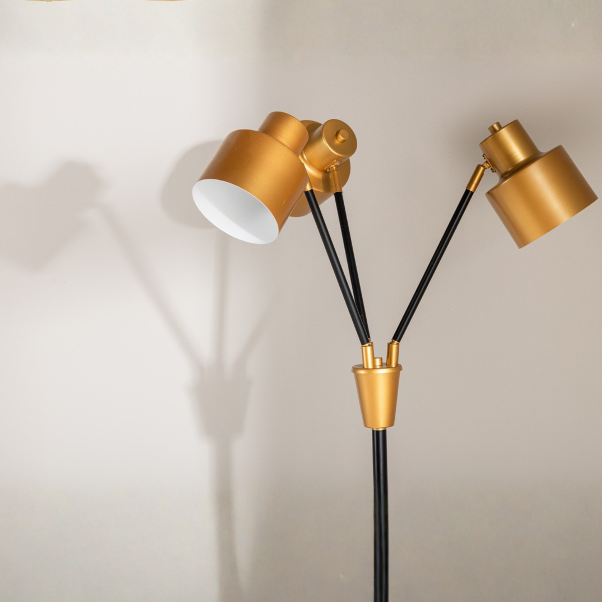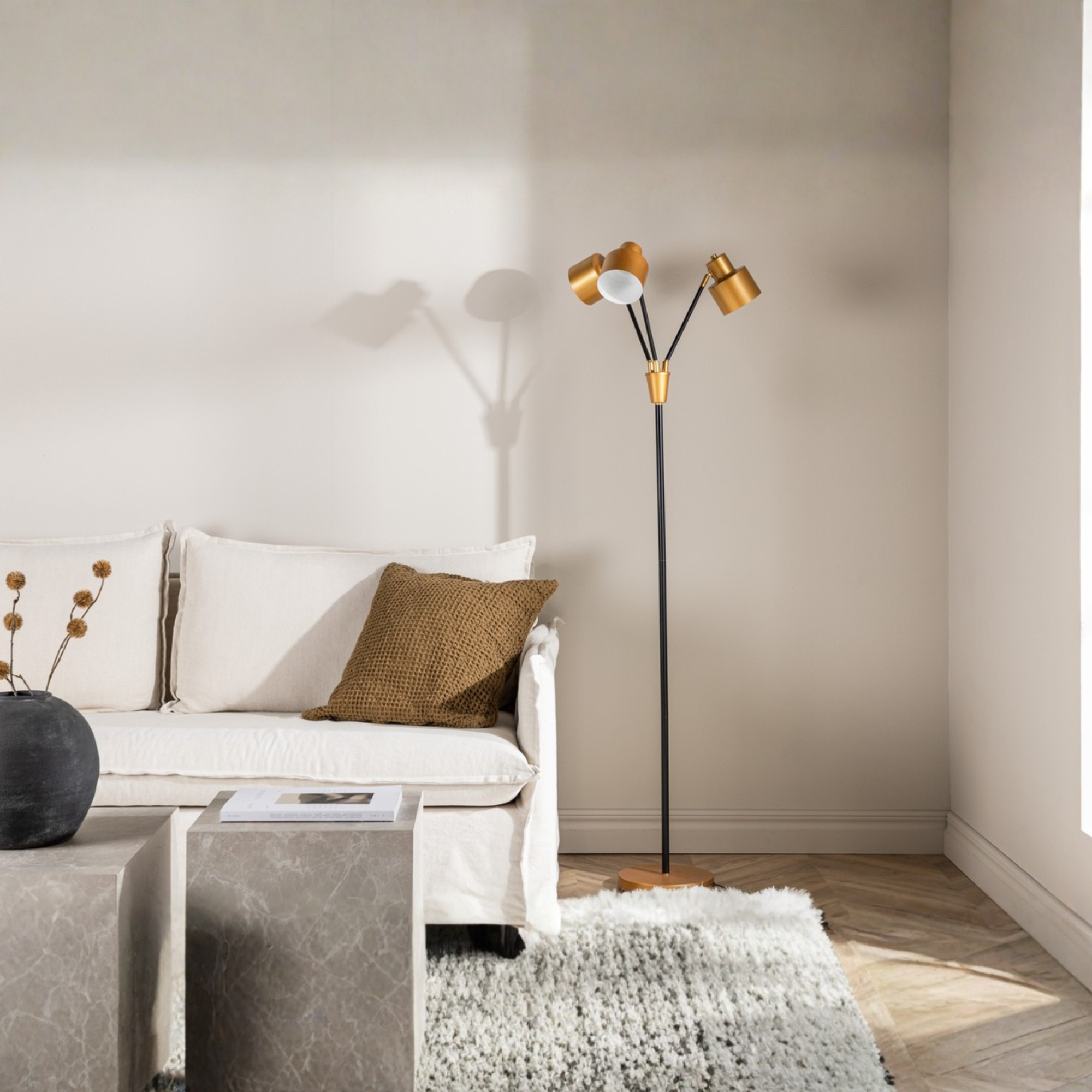 Die Stehleuchte verfügt über drei separate Lichtquellen, die individuell ausgerichtet werden können.