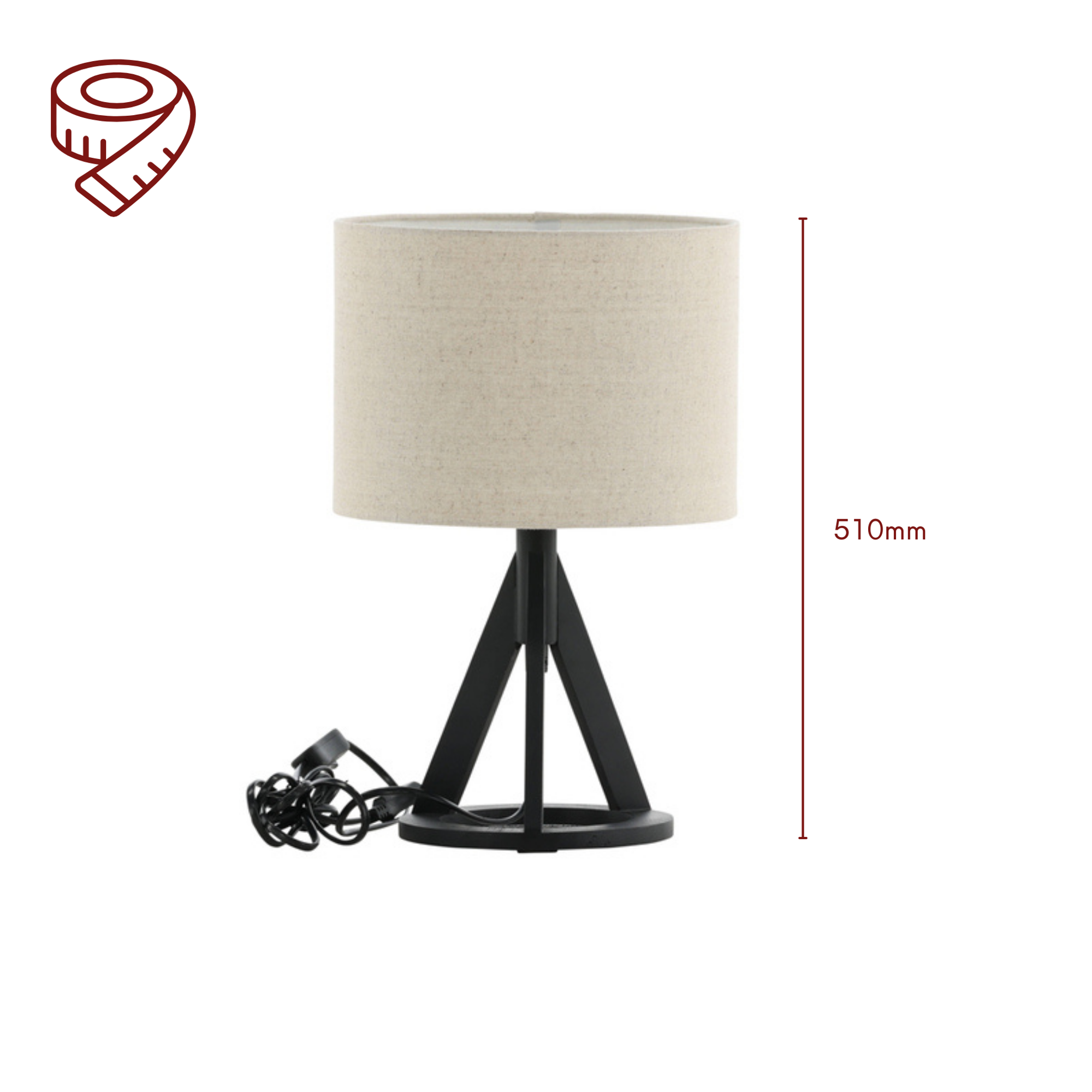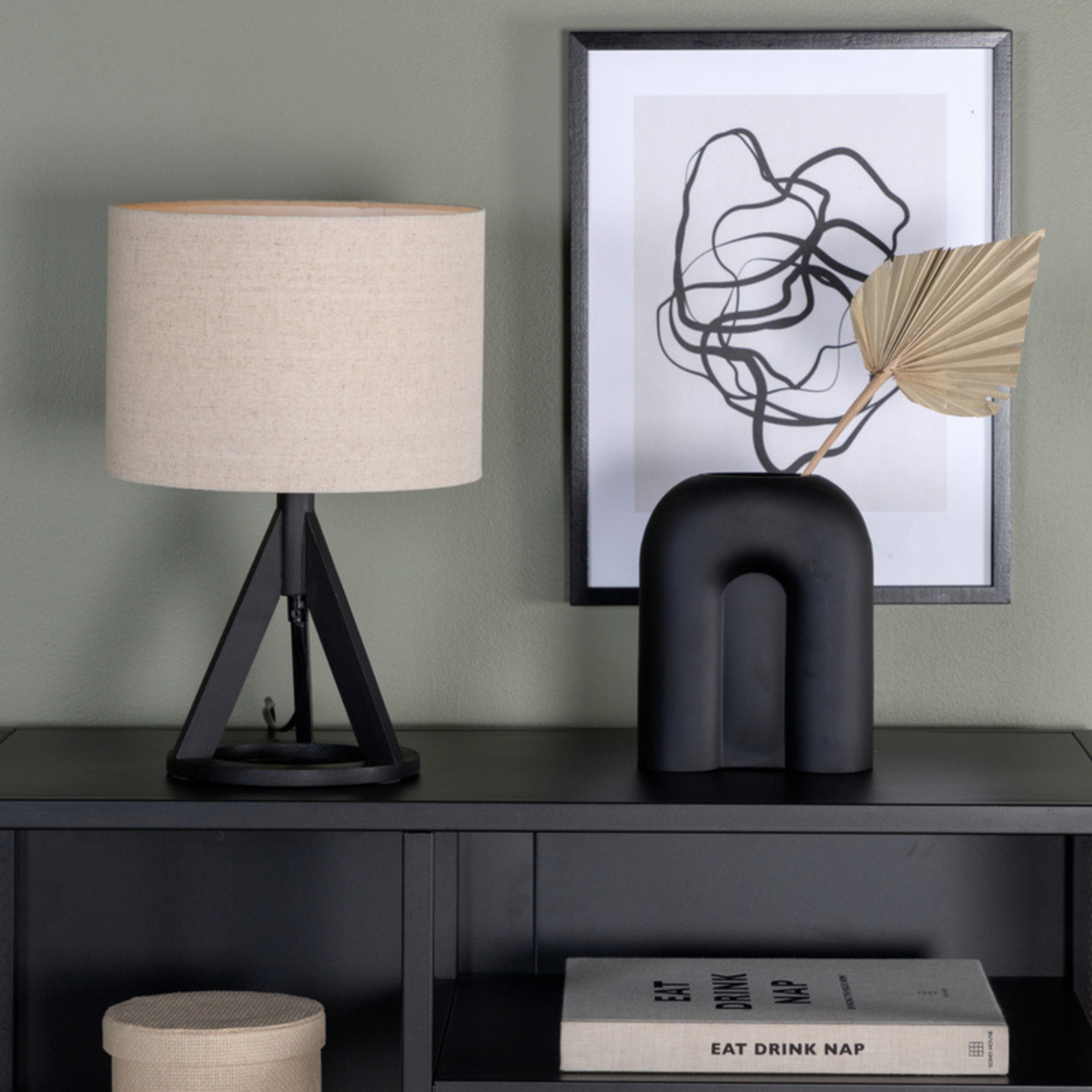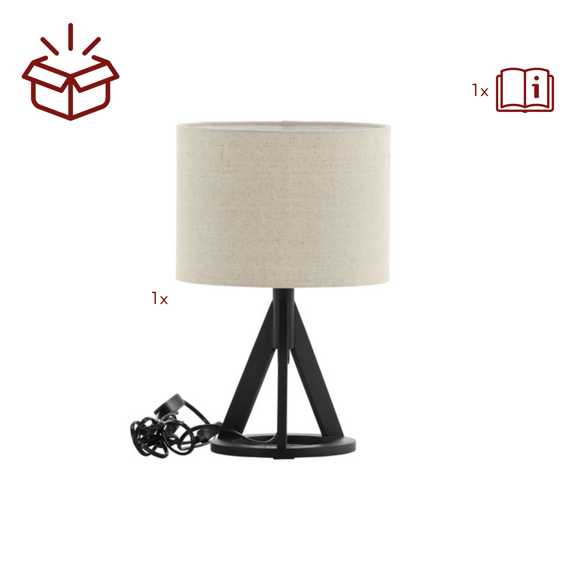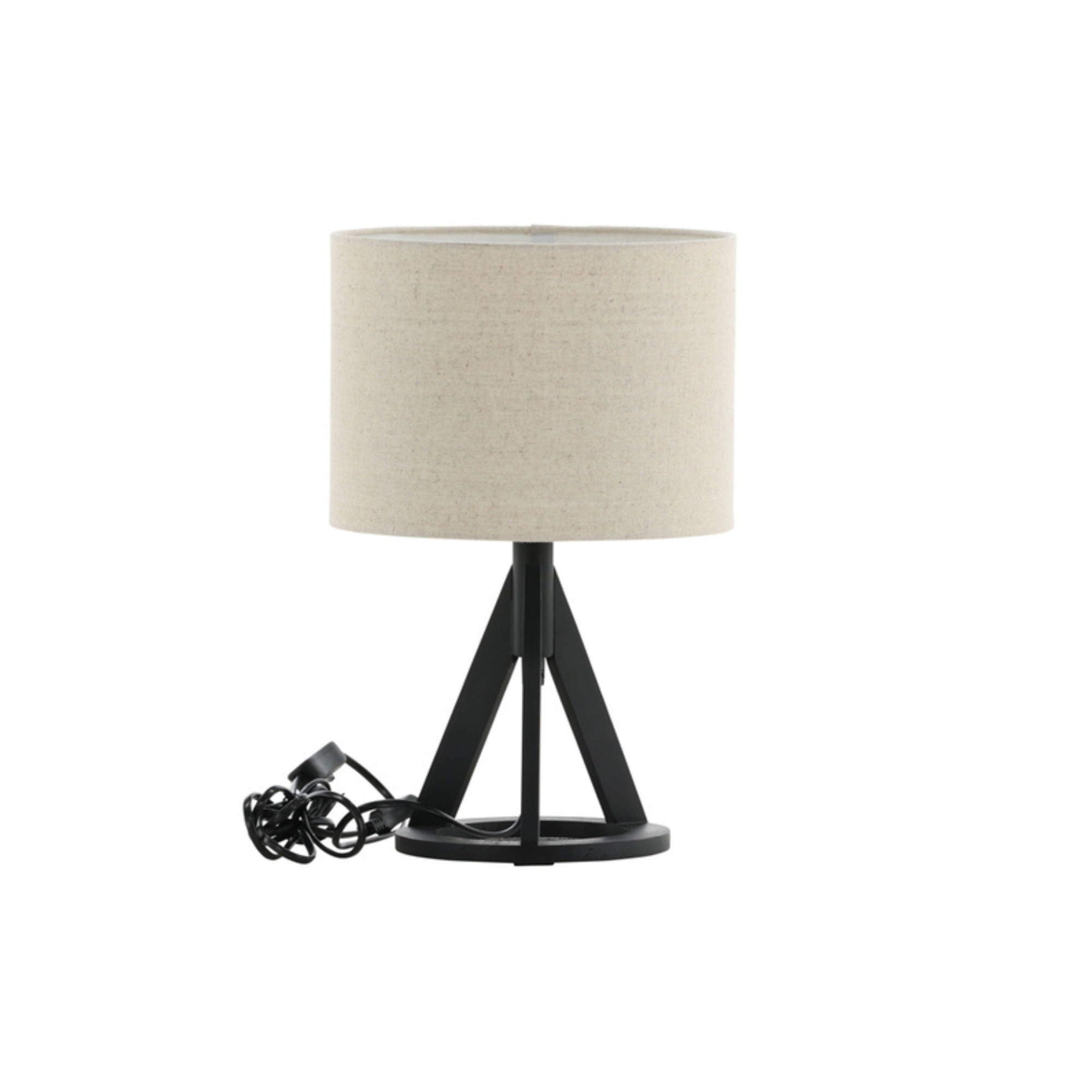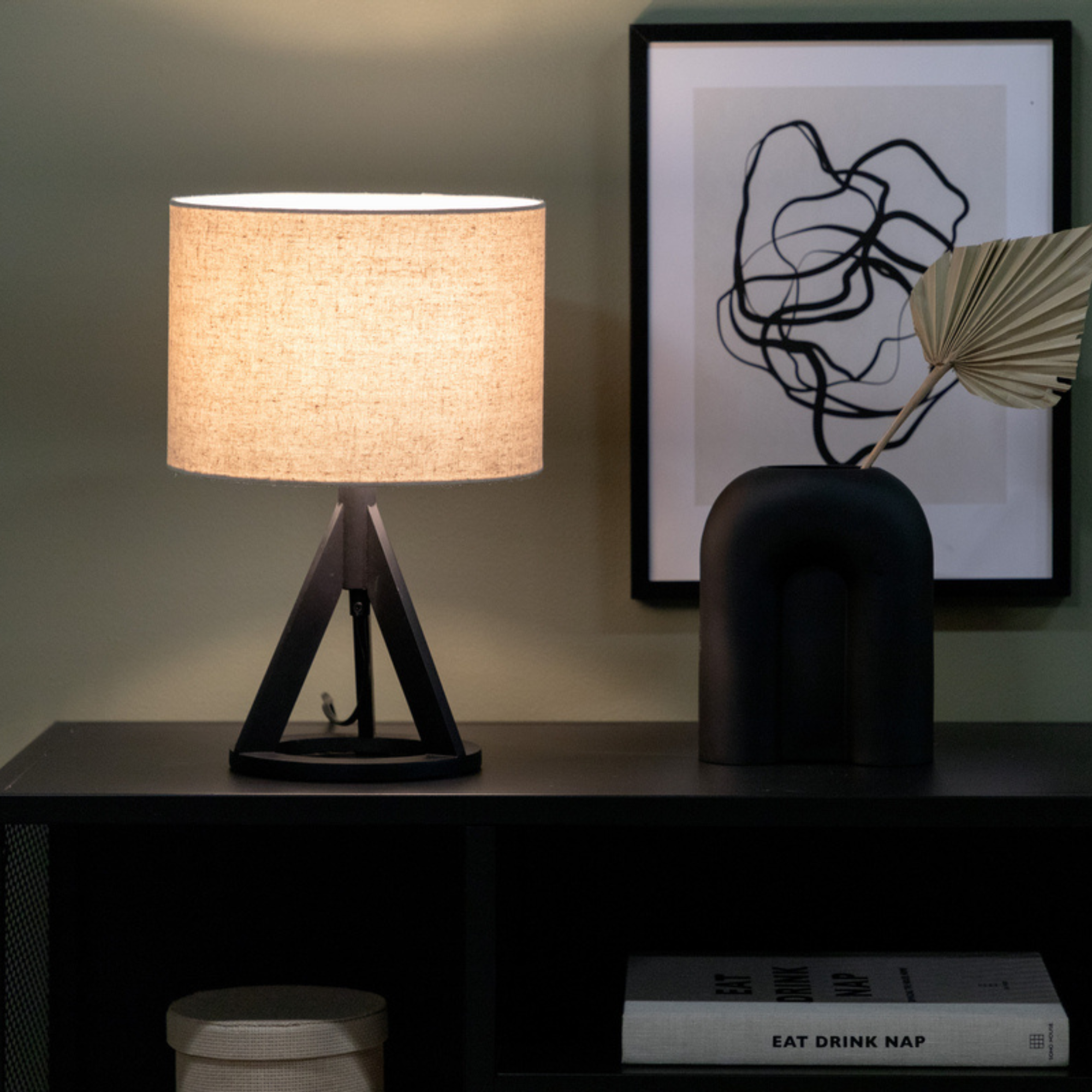 Der dreibeinige Stand aus Holz verleiht der Leuchte eine stabile Basis und eine moderne Optik. In Kombination mit dem Lampenschirm aus Leinen entsteht ein harmonisches Gesamtbild mit weicher Ausstrahlung.