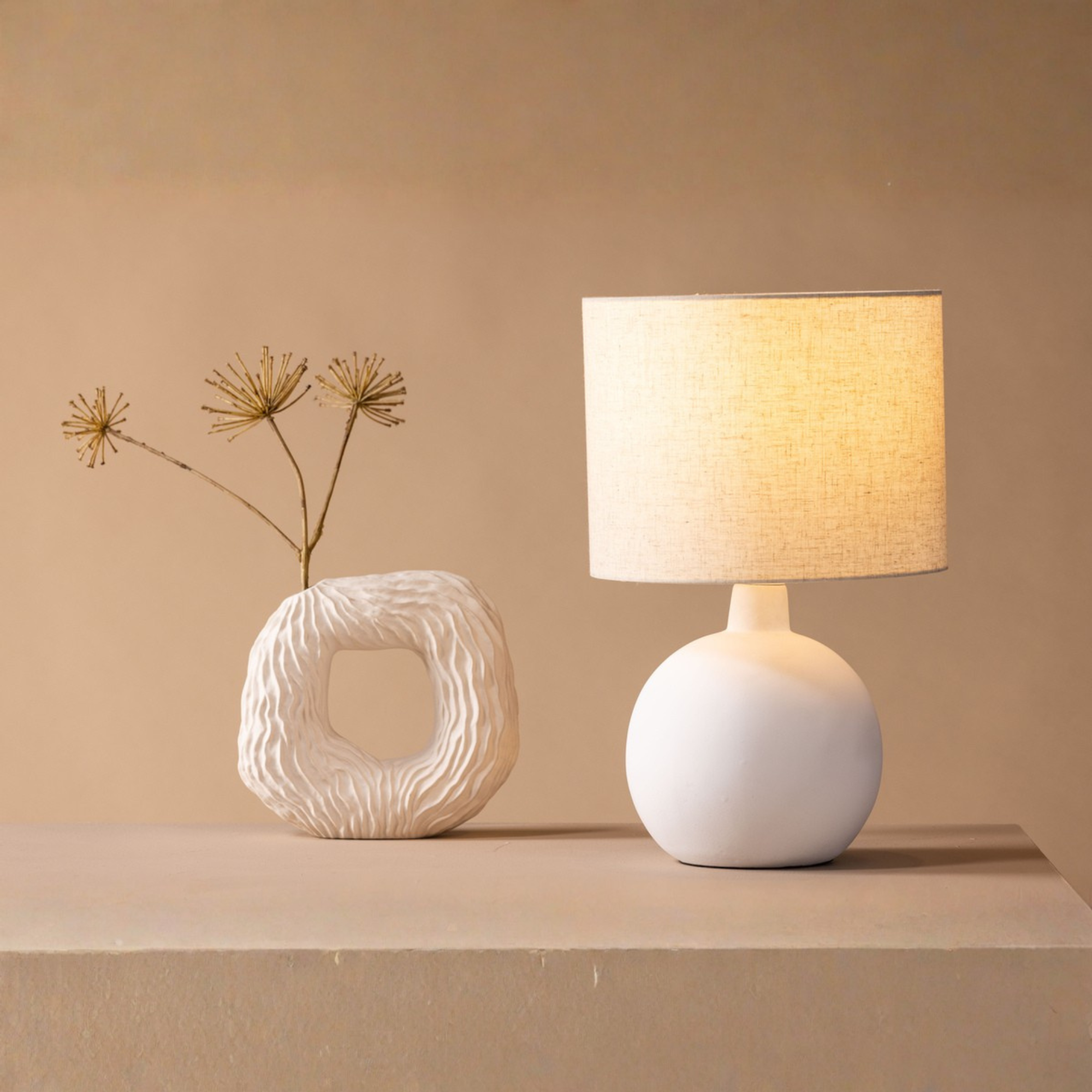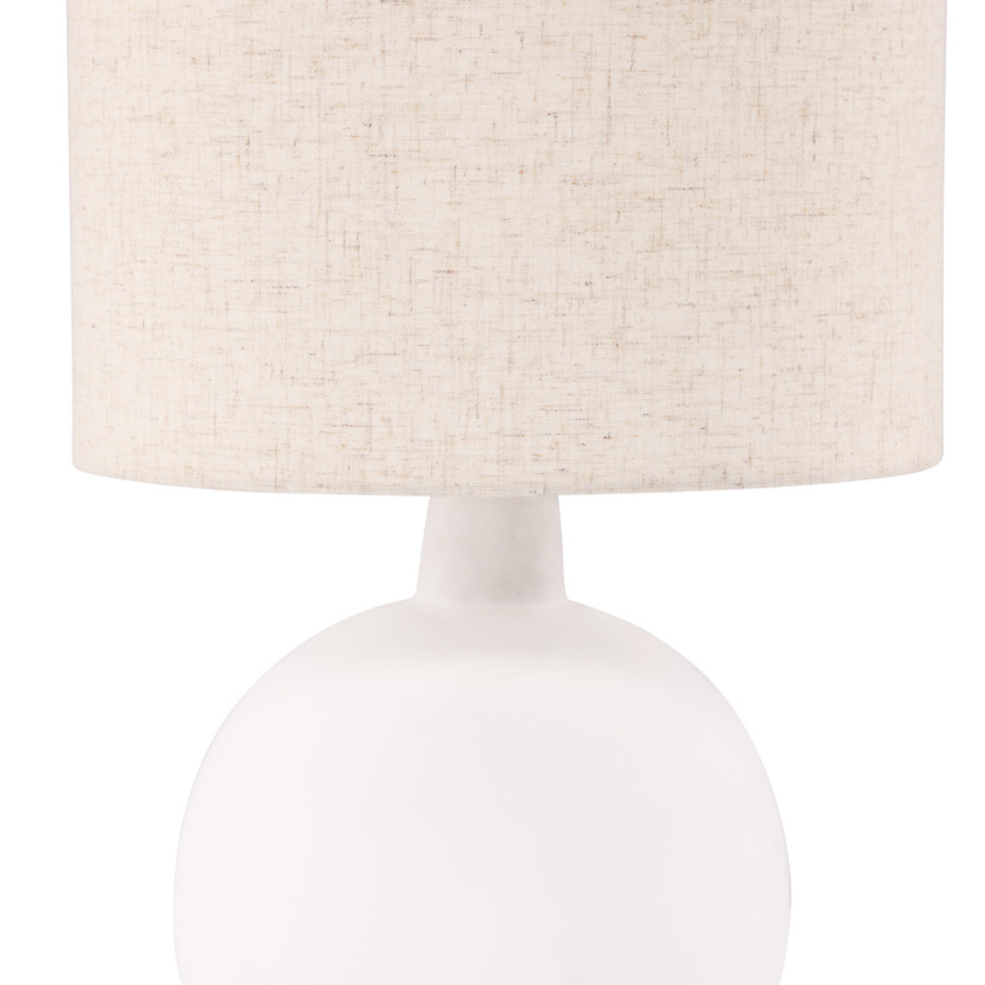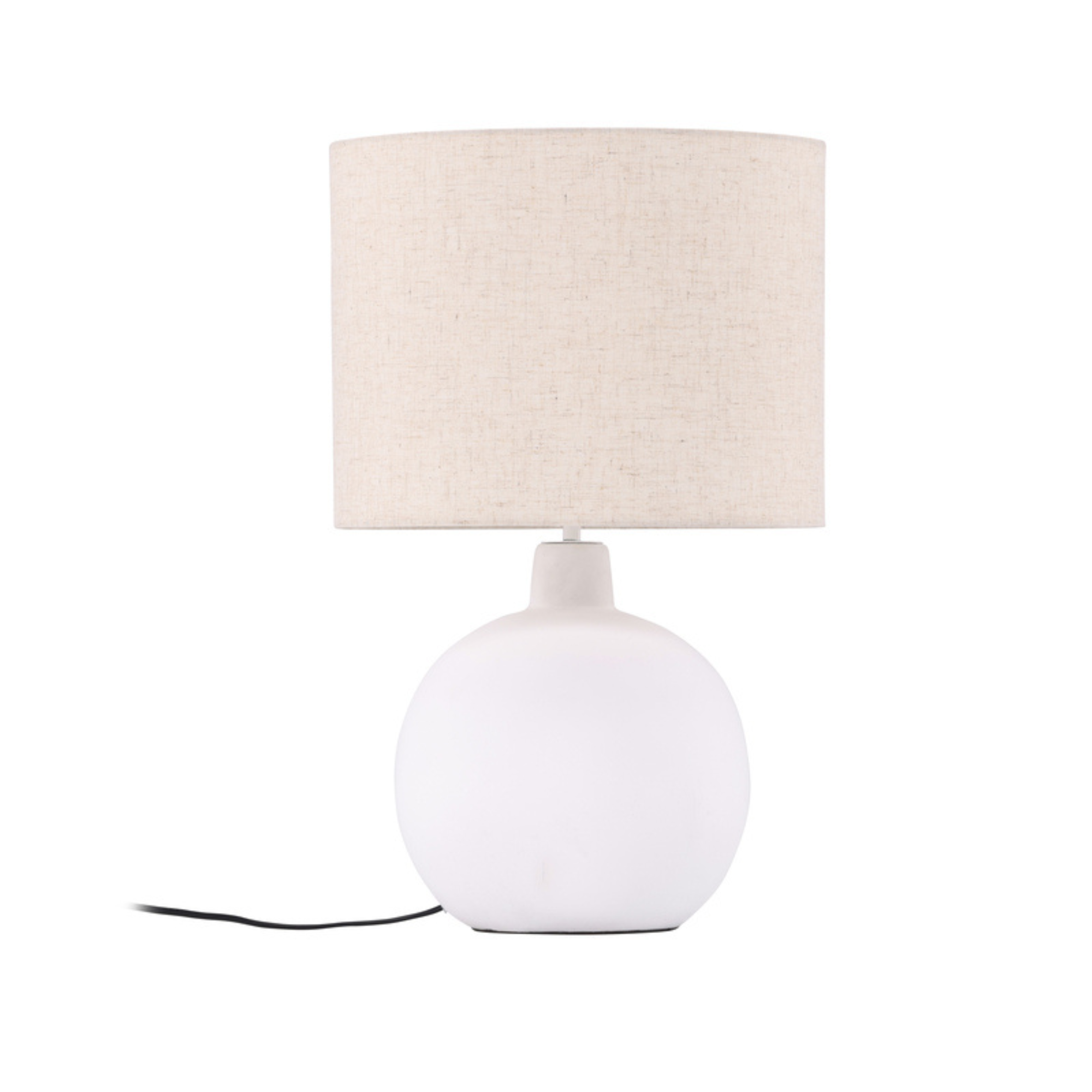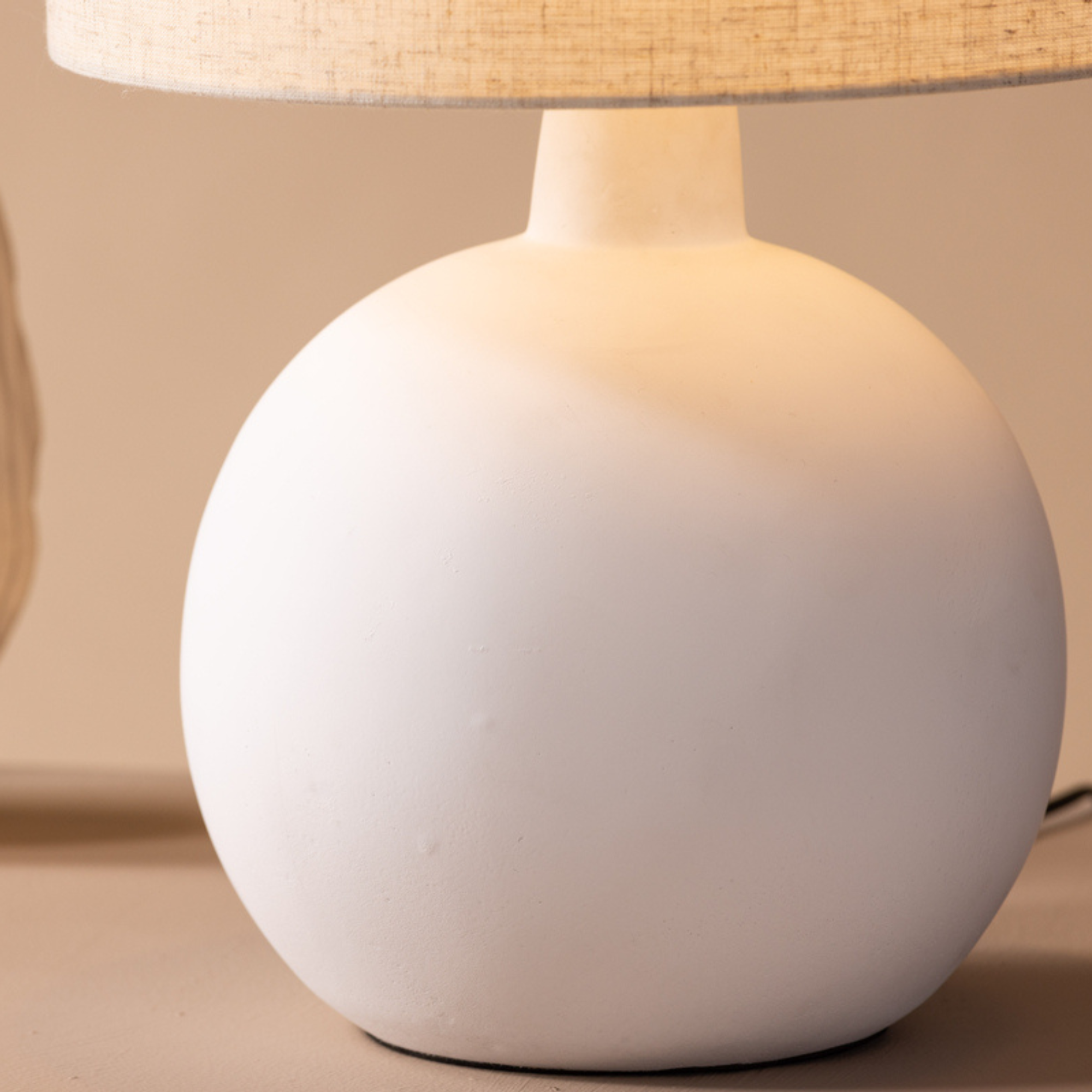 Der runde Lampenfuß aus weißem Beton verleiht der Leuchte eine stabile und hochwertige Basis. Der beigefarbene Lampenschirm aus Leinen sorgt für eine sanfte Lichtstreuung und schafft eine warme, wohnliche Atmosphäre im Raum.