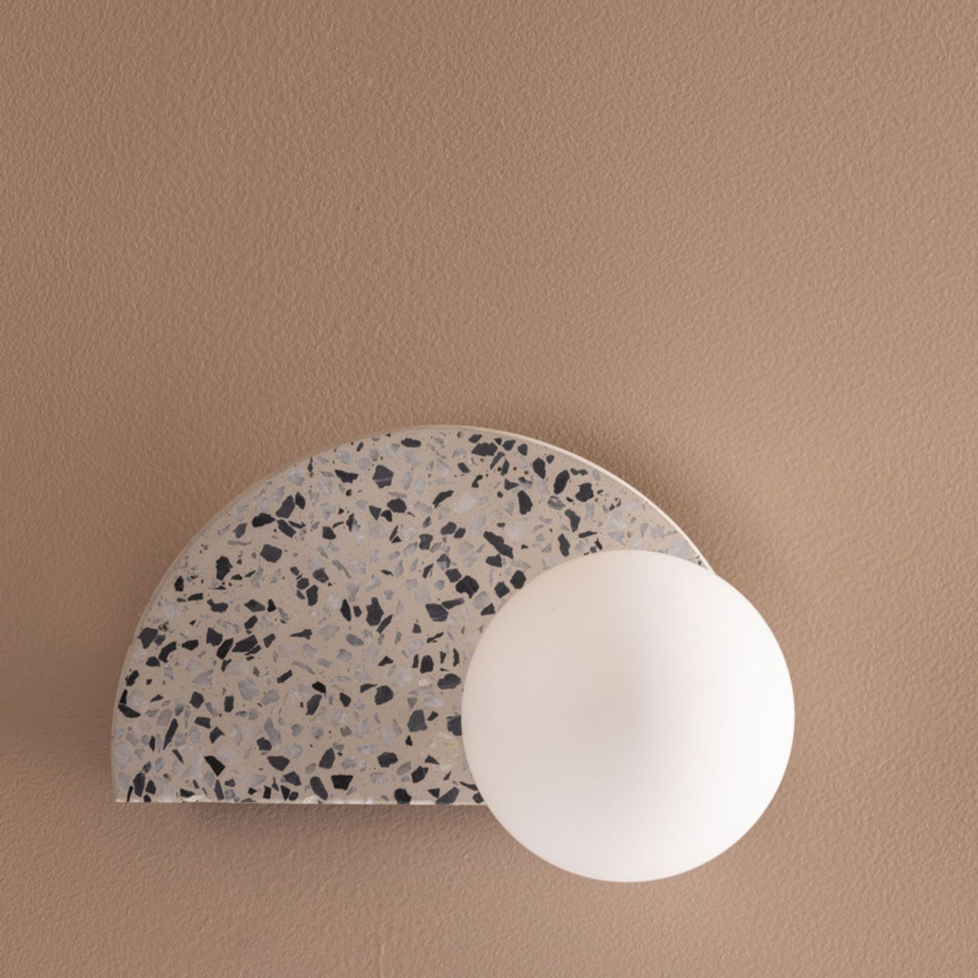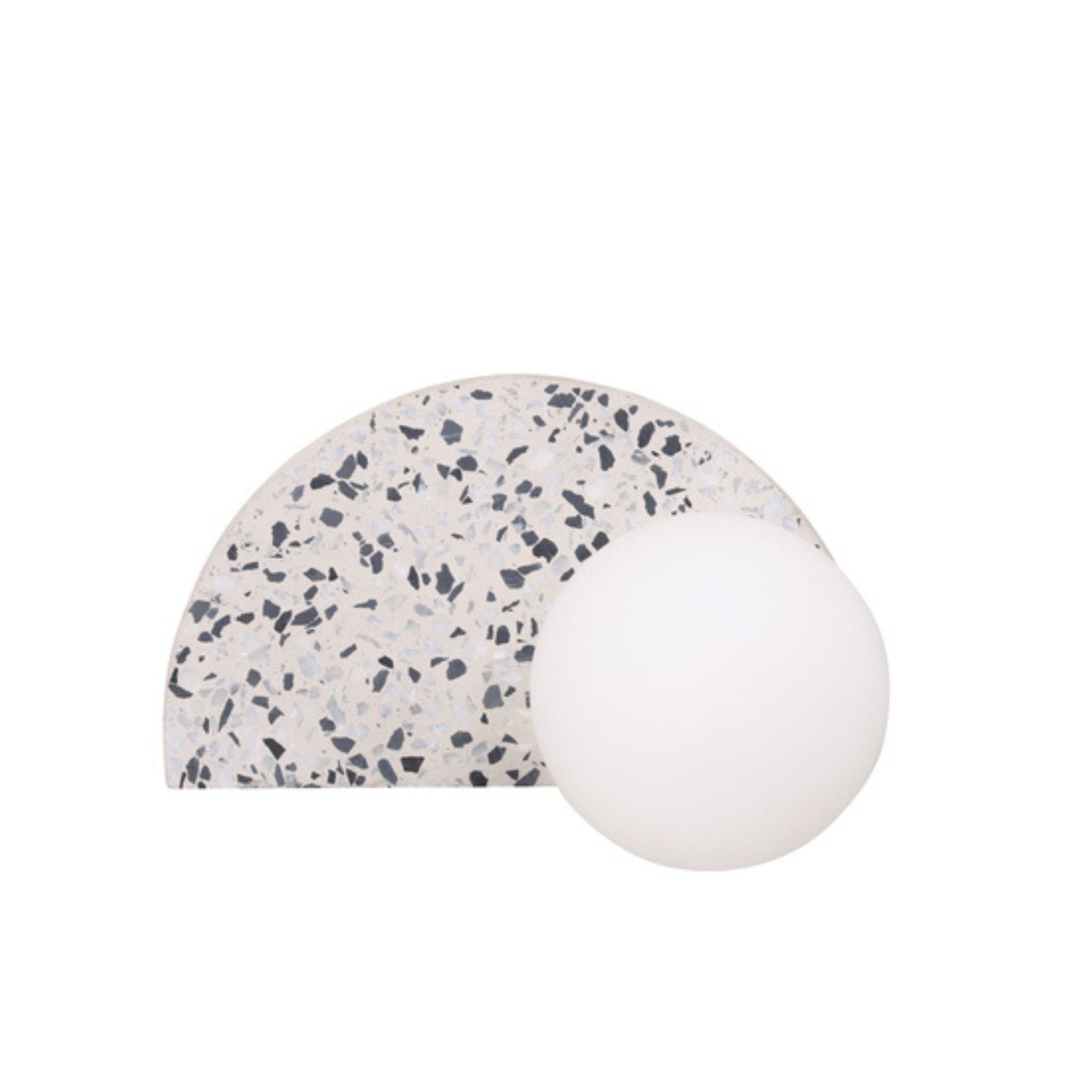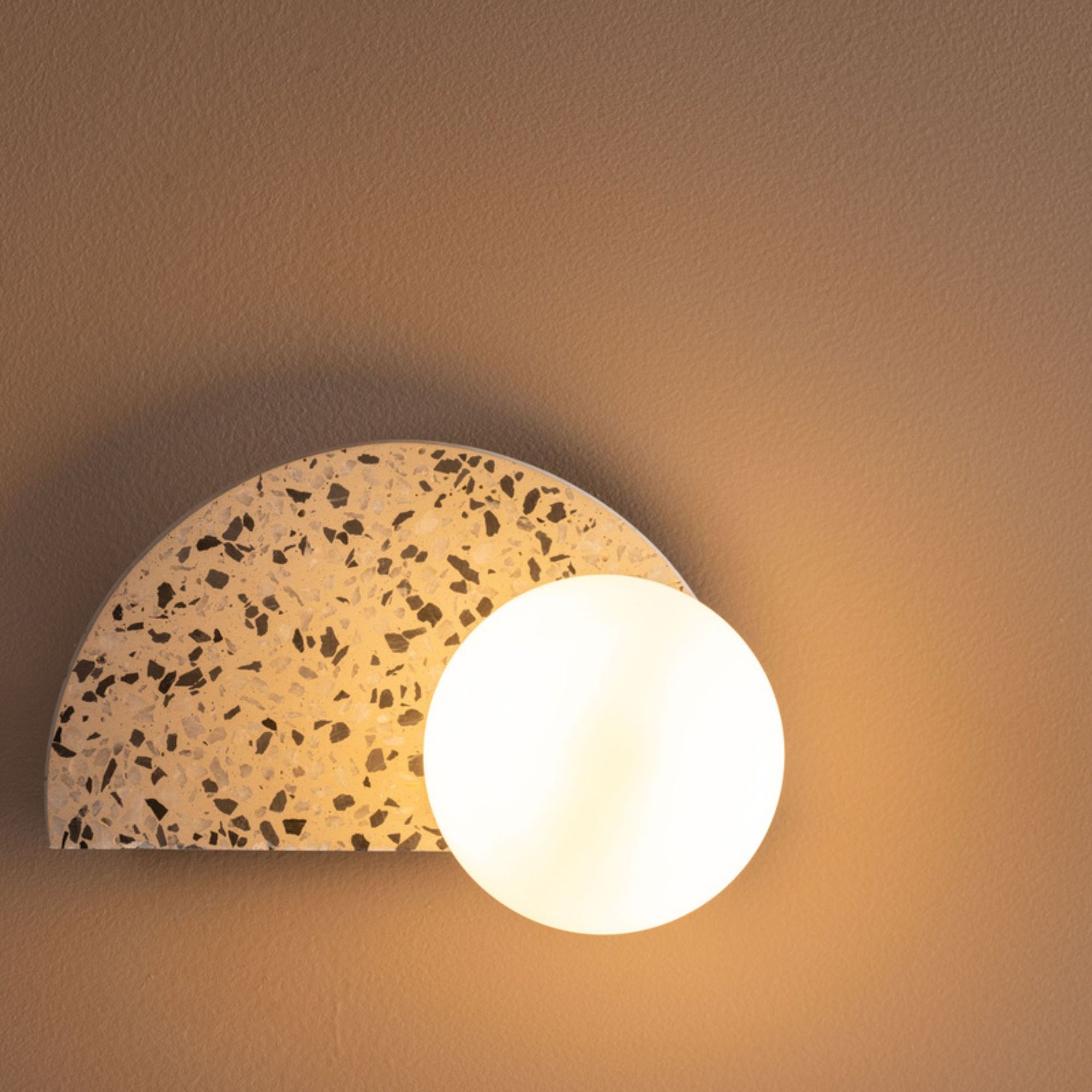 Die Halterung besteht aus weißem Terrazzo mit feinen Einschlüssen in Schwarz und Grau. In der oberen rechten Ecke befindet sich die Lichtquelle mit einem runden, weißen Glasschirm. Dieser sorgt für eine angenehm weiche Lichtwirkung.