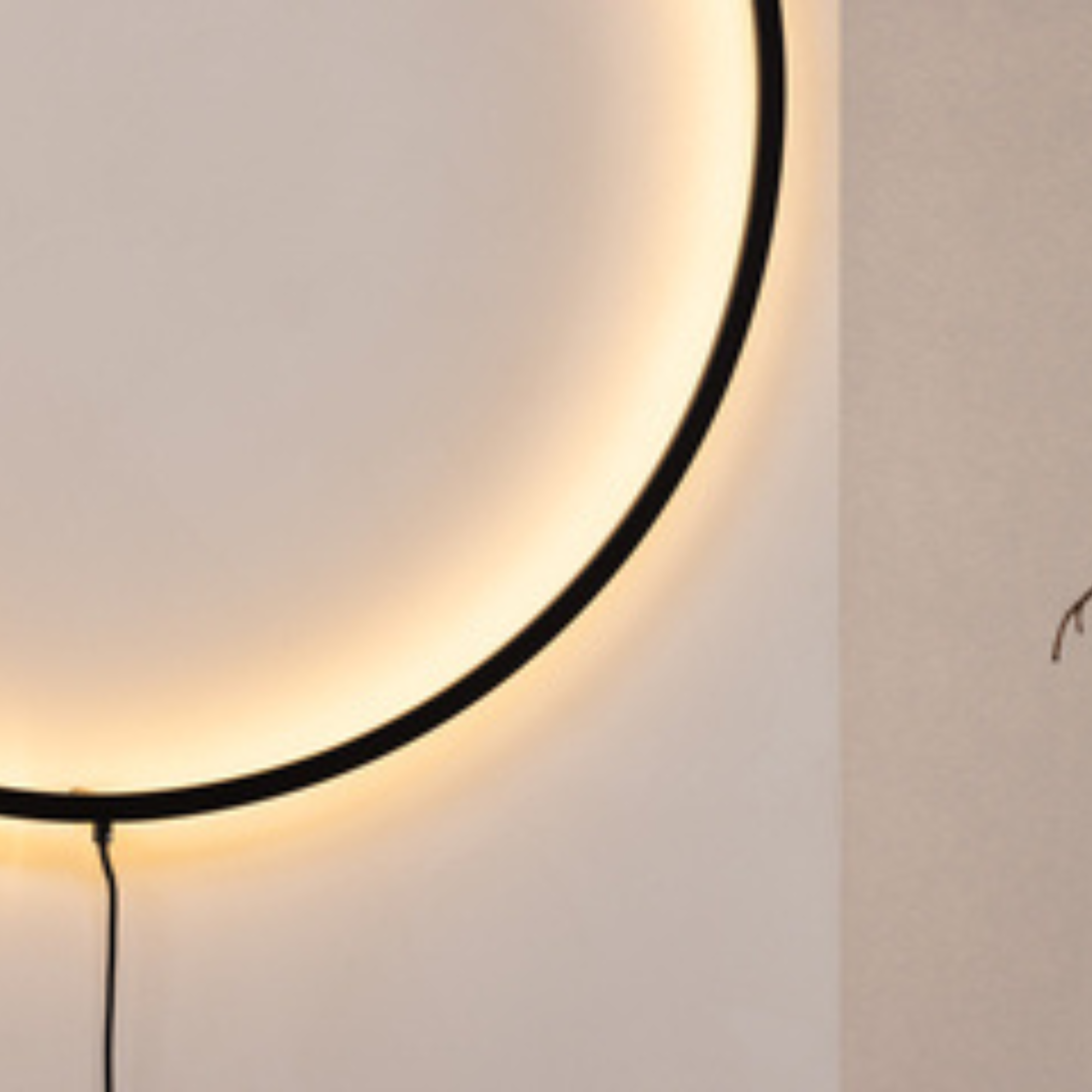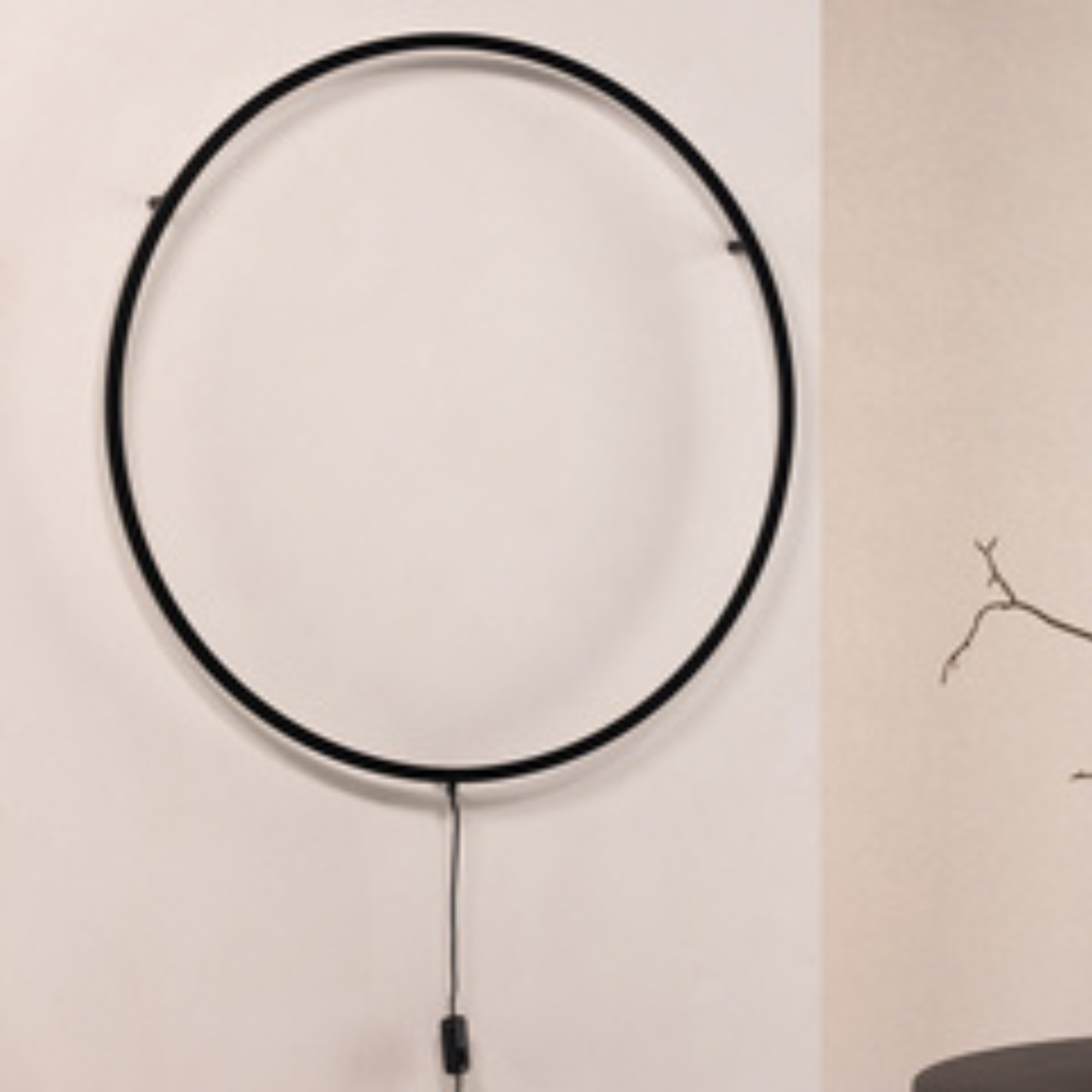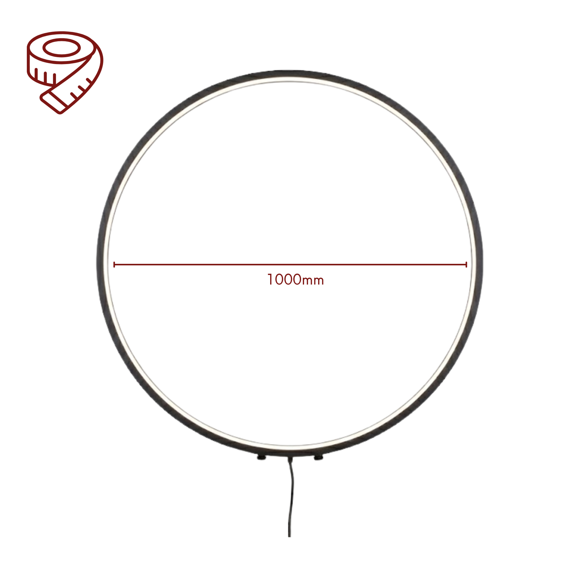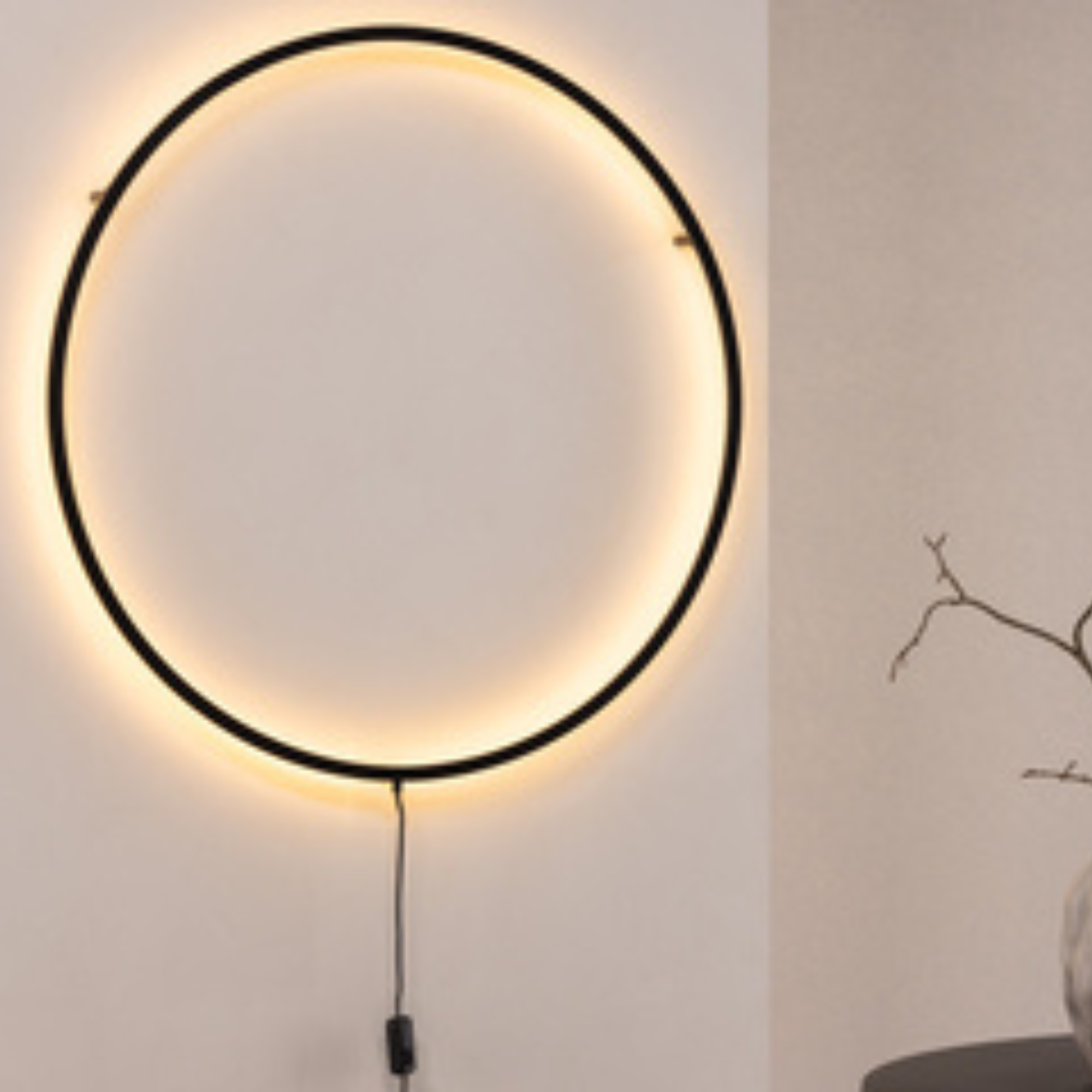 Der schwarze Aluminiumrahmen mit einem Durchmesser von 100 cm umschließt integrierte LED-Lichtquellen, die für eine indirekte, angenehme Lichtwirkung sorgen. Das Licht wird harmonisch an die Wand abgegeben und schafft eine stilvolle Atmosphäre im Raum.