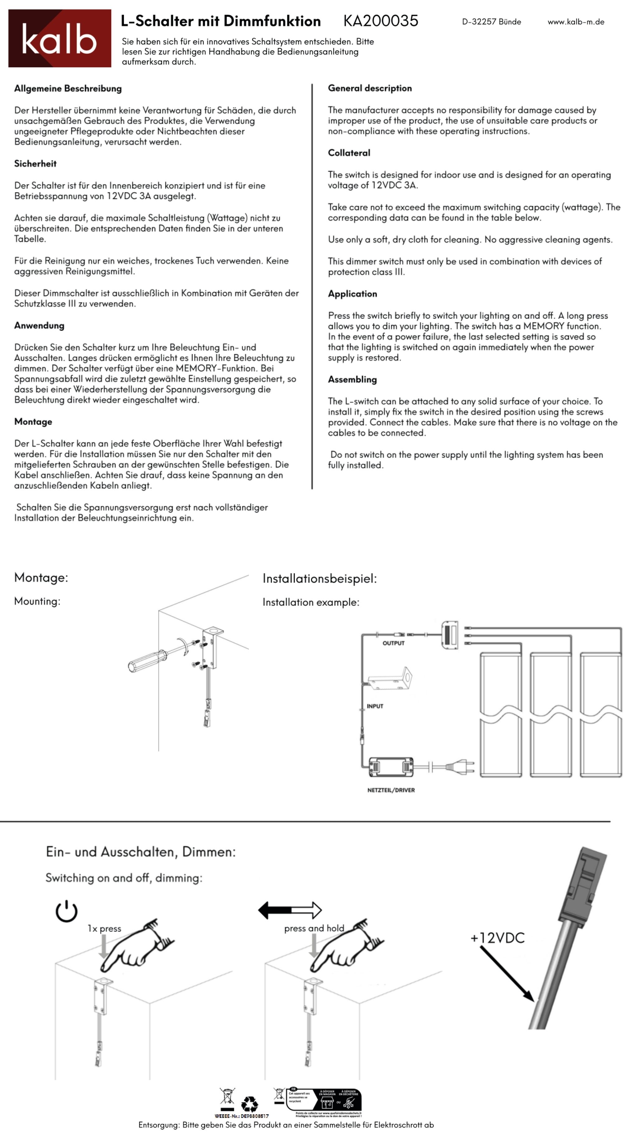 kalb | L-Schalter schwarz, Ein/Aus Dimmen, 200cm Ein- & Ausgangskabel, 12VDC, max. 3A