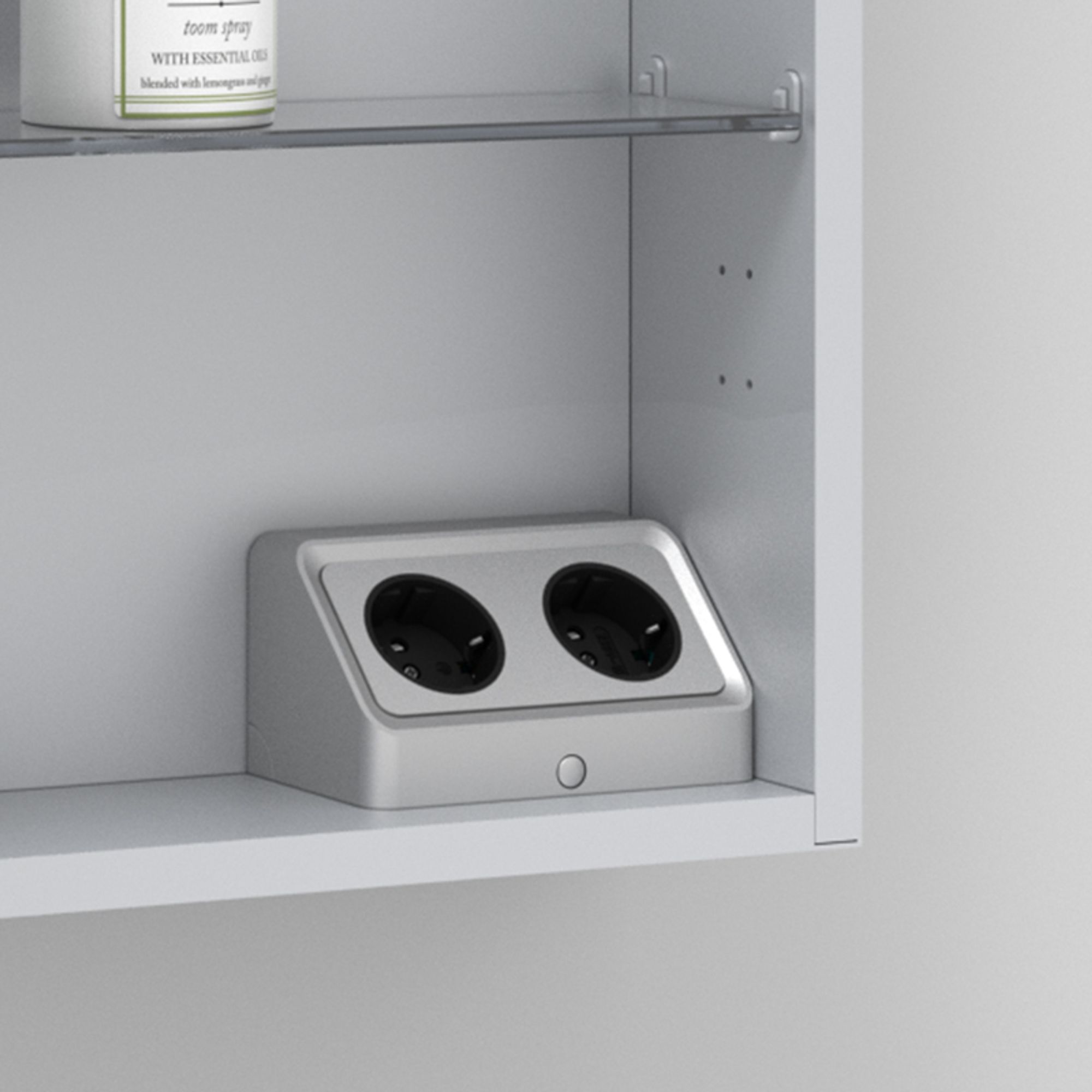 Die kalb Avena ist eine angewinkelte 2-fach Einbausteckdose für den platzsparenden Einsatz in Möbeln, insbesondere in Badezimmerschränken, Oberschränken oder anderen Einbausituationen mit begrenztem Raumangebot. Beide 230 V AC Steckdosen sind dauerhaft aktiv und für den gleichzeitigen Anschluss elektrischer Geräte ausgelegt.