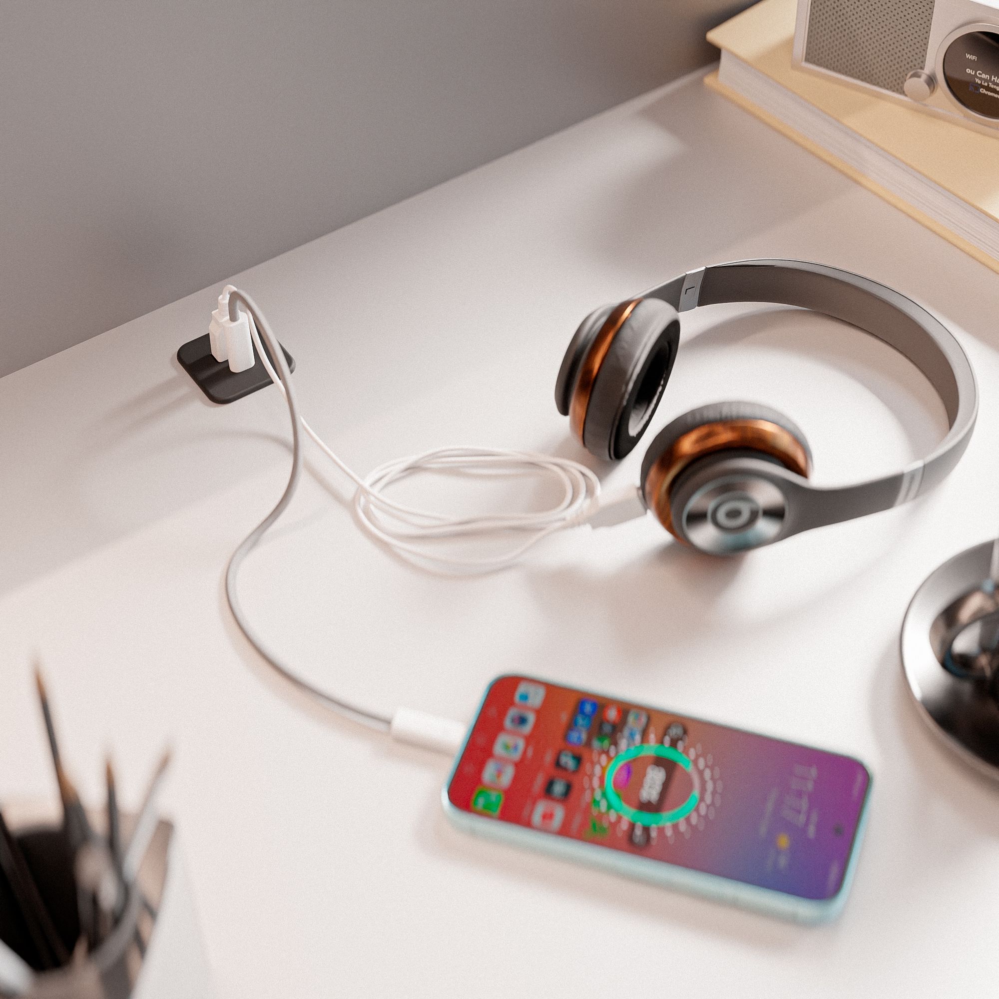 Kompakt & bündig — 33×33×28 mm; verschwindet bündig in Tisch-/Arbeitsplatten und hält Flächen aufgeräumt; fester Ladepunkt für Büro, Küche oder Konferenzraum