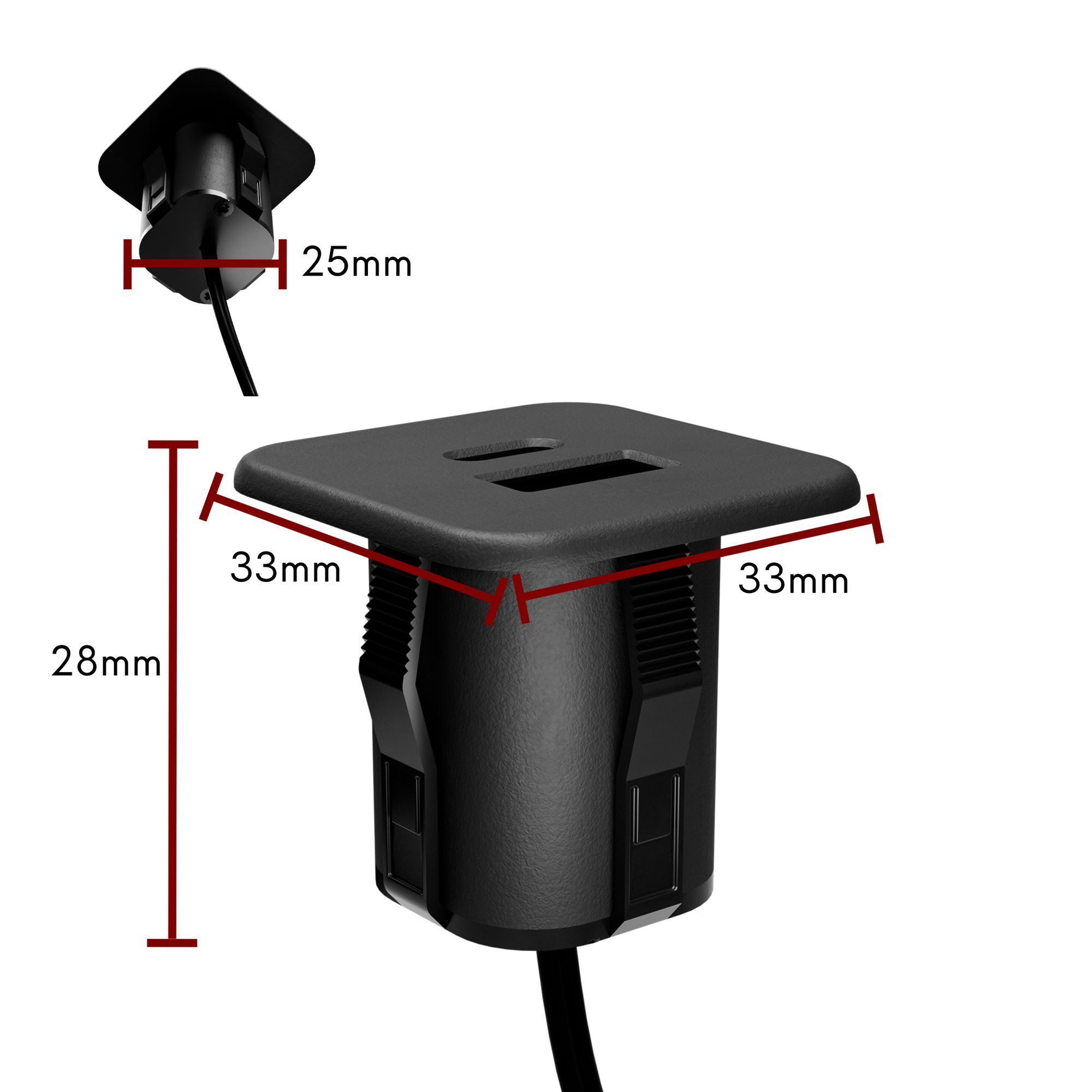 Kompakt & bündig — 33×33×28 mm; bündiger Einbau in Tisch-/Arbeitsplatten und Wohnmöbel; fester Ladepunkt für Büro, Küche oder Konferenzraum, reduziert Kabelsalat